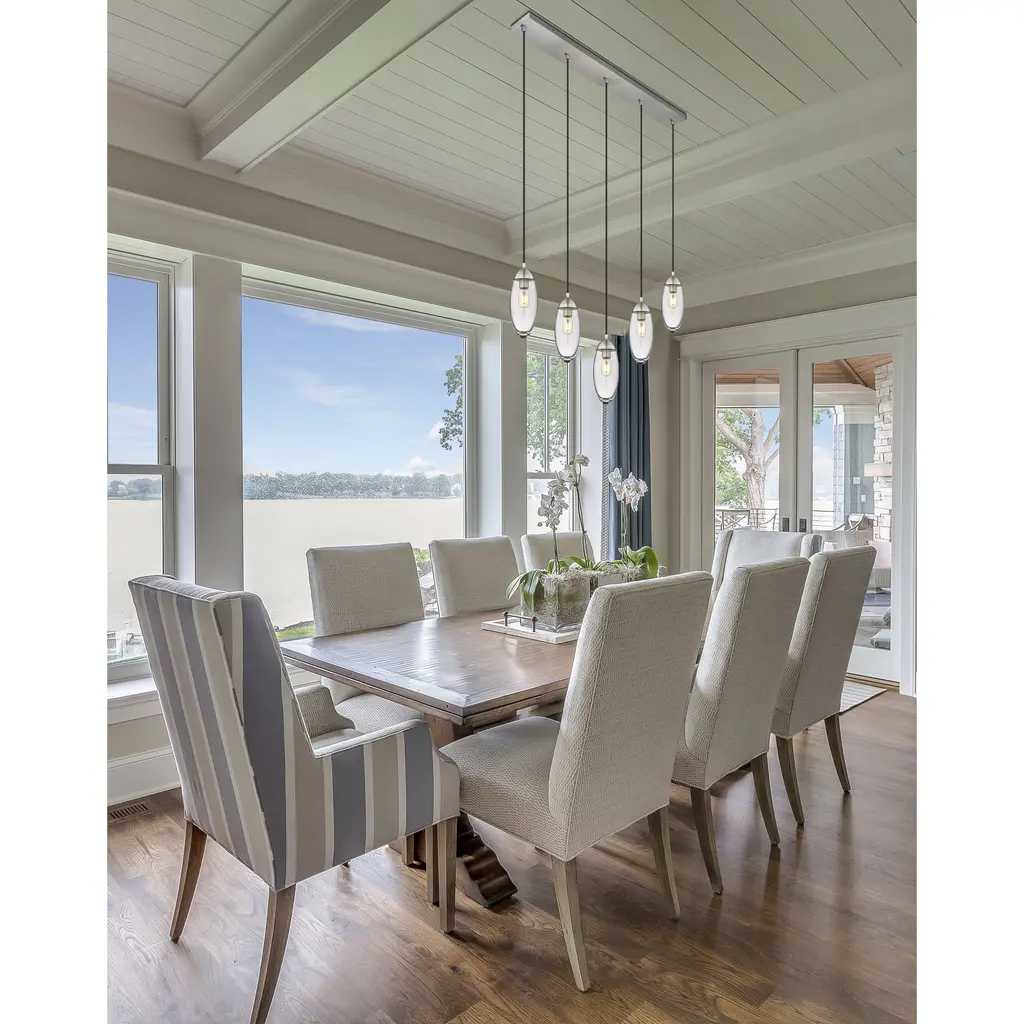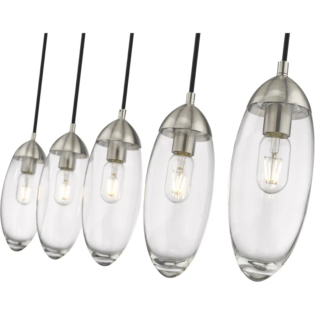 An enticing placement of radiant teardrop glass shades creates a study in architectural artistry perfect to frame a kitchen island or dining space in a contemporary setting. This five-light chandelier delivers organic sensibility with enough pizazz to attract attention as it emits reflective illumination in shades that dangle from a cool brushed nickel finish metal canopy.