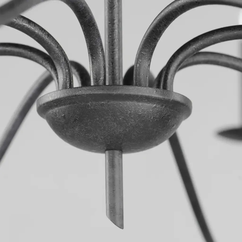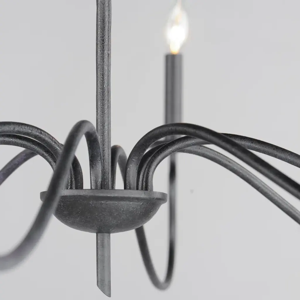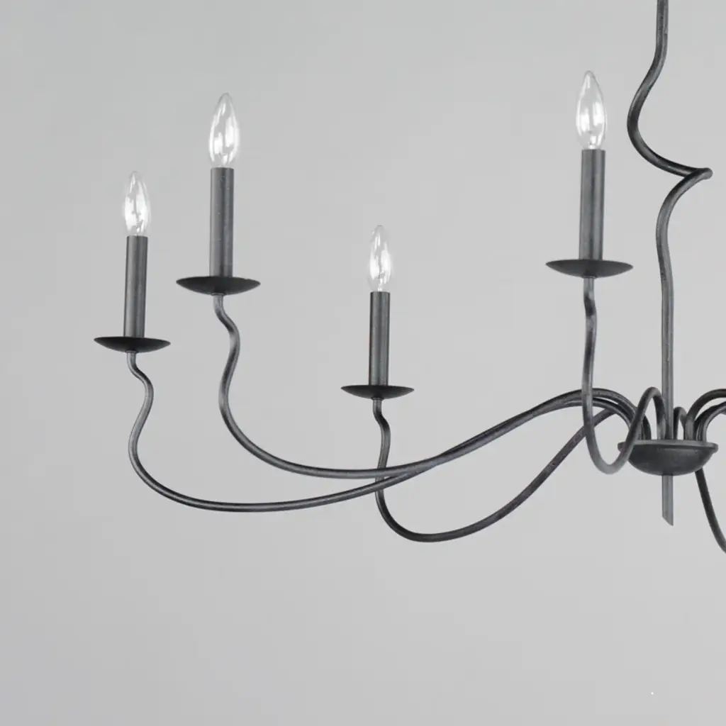 The sinuous form of thin arms outstretches and curves in a classic forged iron chandelier design. It seduces its audience with a wild turn at its center stem that ends with a charming hook detail replacing the conventional top loop. Completed in a black oxide finish, this collection combines the best elements of Spanish revival and French country design in boldly spanning diameters.
