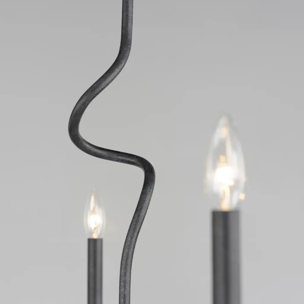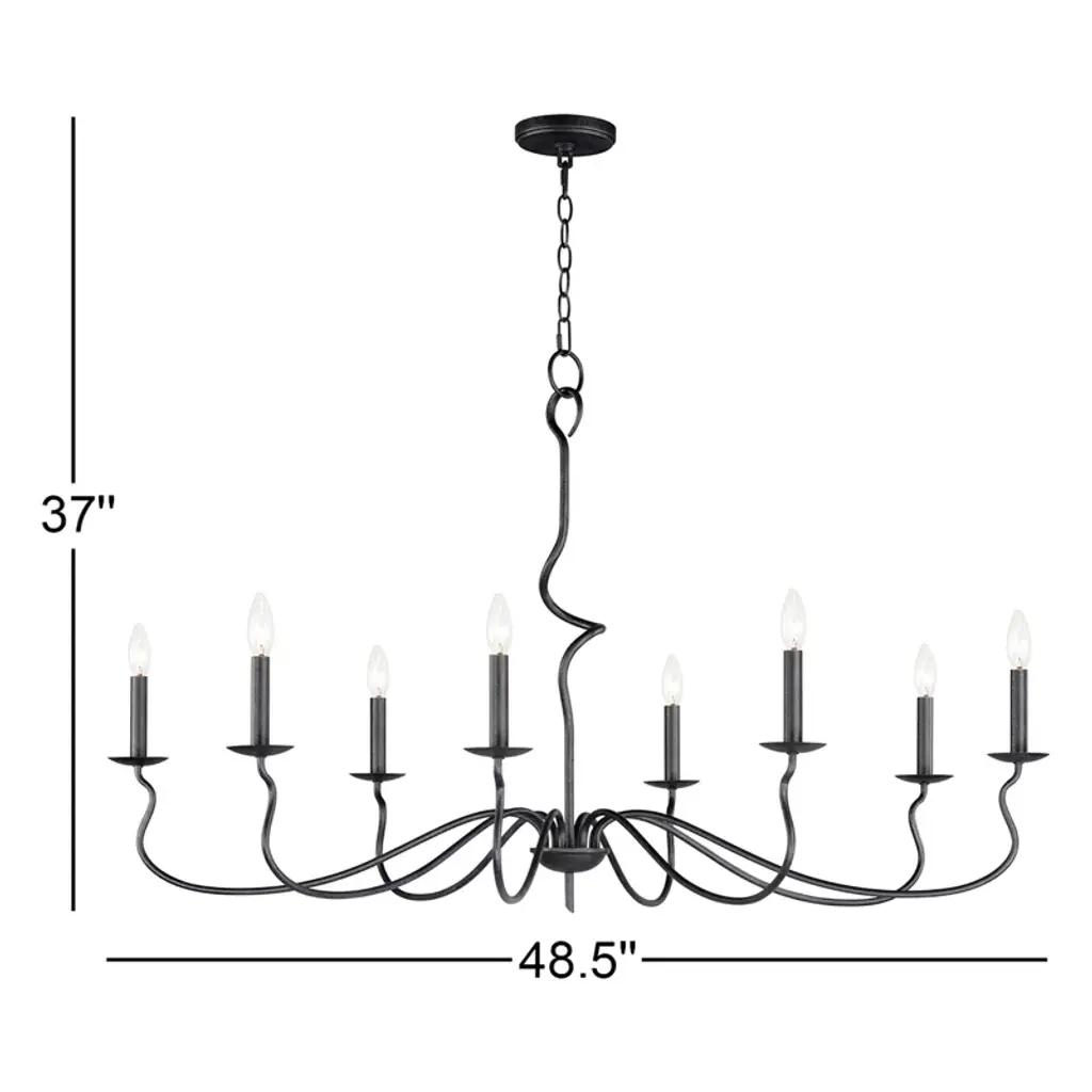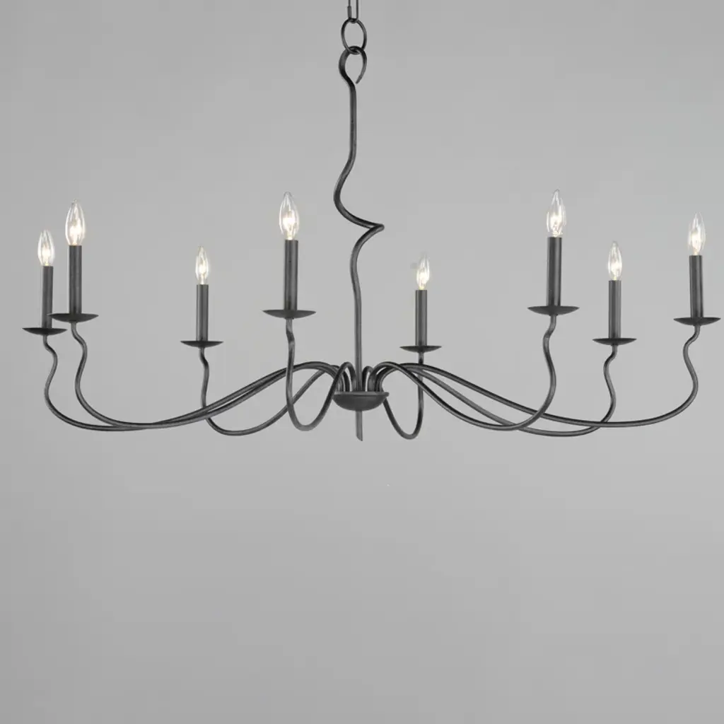 The sinuous form of thin arms outstretches and curves in a classic forged iron chandelier design. It seduces its audience with a wild turn at its center stem that ends with a charming hook detail replacing the conventional top loop. Completed in a black oxide finish, this collection combines the best elements of Spanish revival and French country design in boldly spanning diameters.