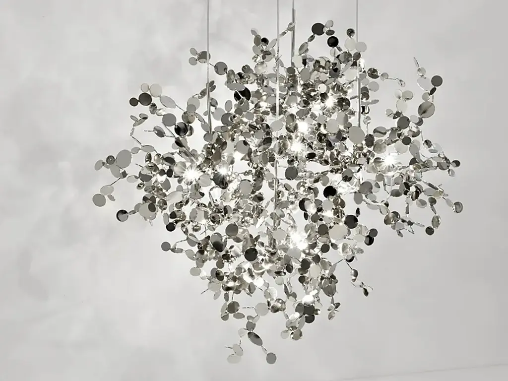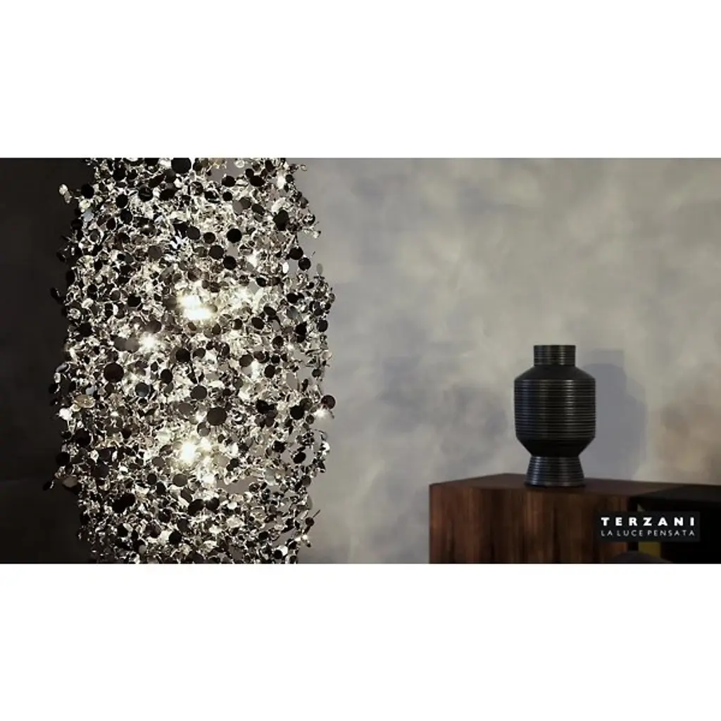 A tall cloud of shimmering light. The Argent Large LED Chandelier by Terzani is a dazzling ellipse designed by Dodo Arslan. It sparkles and flashes in all directions, thanks to countless Stainless Steel discs arranged by hand into a seemingly random array. The shiny surface of each disc and the infinite number of angles in which they’re arranged result in a fantastic play of light and shadow. It’s at once fluffy, like the cloud for which this design is named, and undeniably decadent, a statement piece for sure, whether it’s hanging in a tall entryway or brightening a dark corner of the living room.