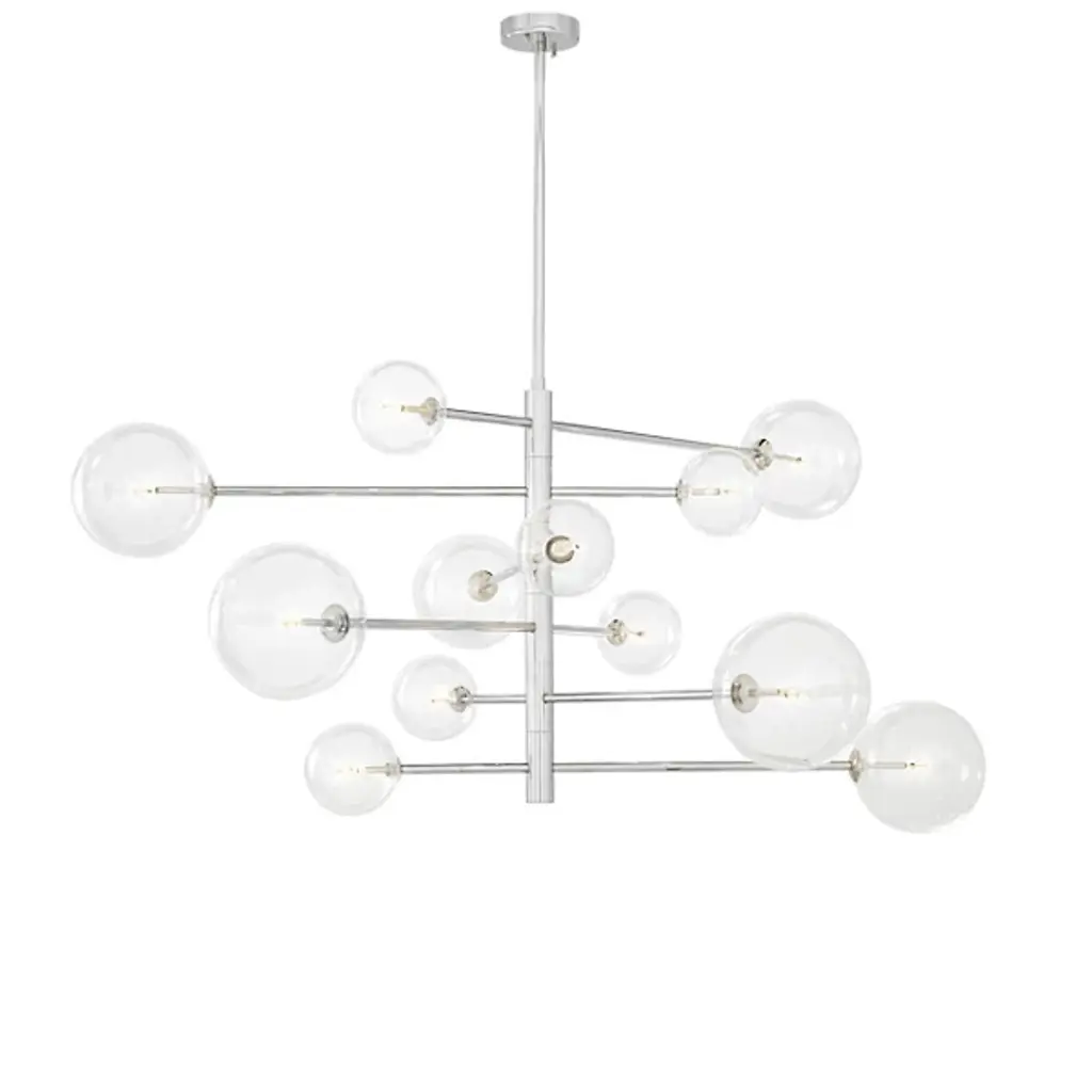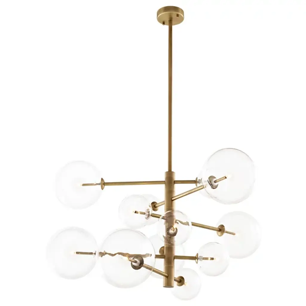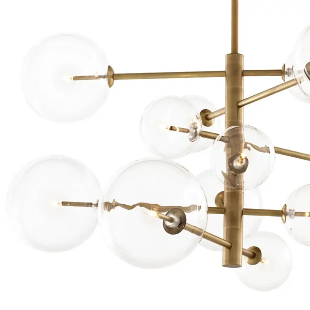 The Argento Chandelier by Eichholtz has a cool, retro-chic feel as it artfully re-interprets beloved mid-century modern style with an asymmetrical twist. A single down rod and central stem provide the foundation for an array of sleek stems to extend from, each one reaching out at a different length to create a dynamic composition. At the end of each of these arms, a smooth, hand-blown glass globe sits to help offer a beautiful layer of omnidirectional illumination to surroundings.