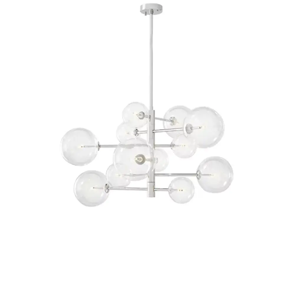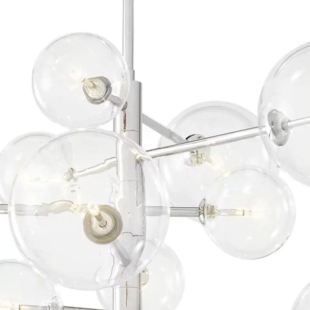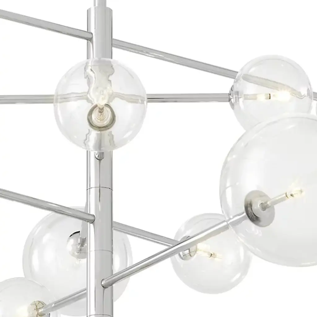 The Argento Chandelier by Eichholtz has a cool, retro-chic feel as it artfully re-interprets beloved mid-century modern style with an asymmetrical twist. A single down rod and central stem provide the foundation for an array of sleek stems to extend from, each one reaching out at a different length to create a dynamic composition. At the end of each of these arms, a smooth, hand-blown glass globe sits to help offer a beautiful layer of omnidirectional illumination to surroundings.