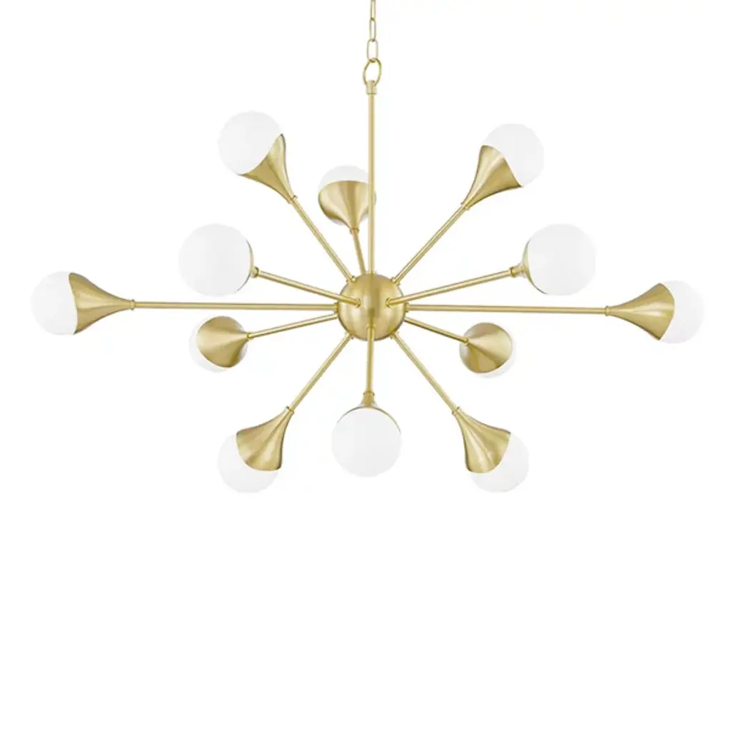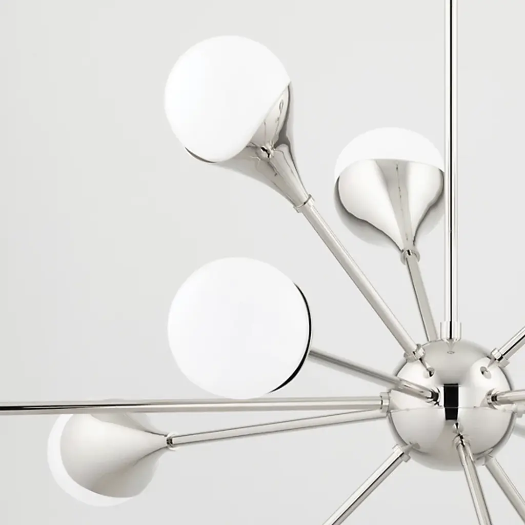 The Ariana Chandelier by Mitzi makes a statement in the rooms it brightens. An elegant, sophisticated update to the modern sputnik-style fixture, the structure of this piece expands from a smooth, spherical central accent. Beautifully finished metal stems expand to create a cool, starburst-shaped silhouette featuring wave-like holders that each support a round glass shade. Casting a lovely layer of light onto surroundings, this design is a stunning choice for a range of spaces.