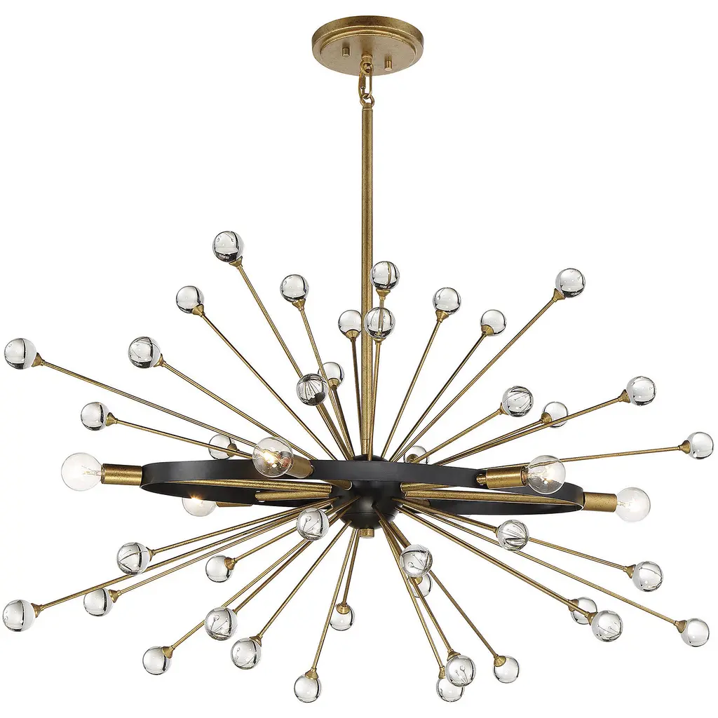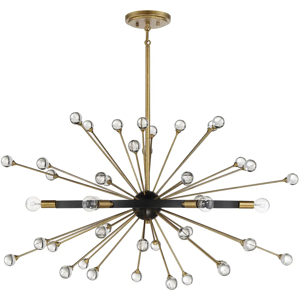 The Ariel 6-light linear chandelier from Savoy House offers a beautifully elegant and modern take on iconic Sputnik style. Slender Gold-finished arms topped with bulbs and crystal baubles emanate from a central sphere orbited by a ring finished in Como Black. Ariel is 37" in length, 18" in width and has an adjustable height ranging from 27" to 73". It uses six candelabra size bulbs of up to 60 watts max per bulb. Comes with four 12" downrods and one 6" downrod, plus 80" of chain.