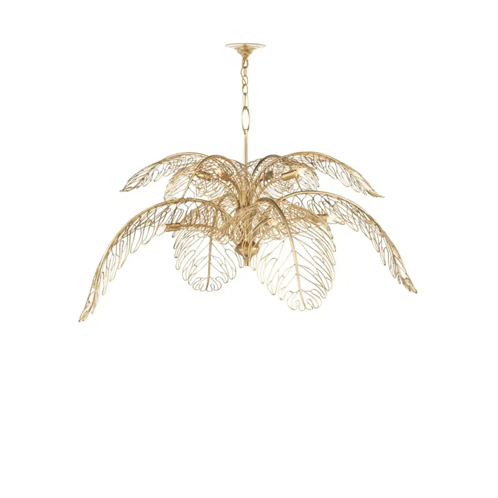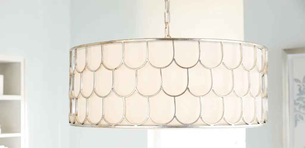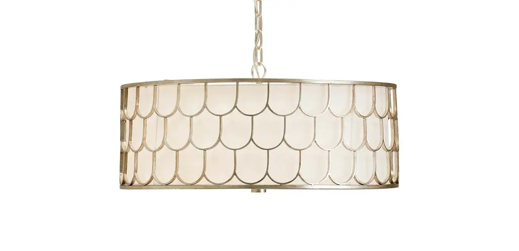 When it comes to this scalloped drum shade chandelier, there’s more than meets the eye. Its unique style boasts a hand-welded, open iron frame with a hand-applied champagne foil finish; it also includes a removable interior shade so you can change up your look without missing a beat! Keep the white fabric shade in for a classic midcentury drum chandelier look, or remove it to let its updated, spacious style shine. It also includes a diffuser to create a warm, ambient glow—perfect for illuminating intimate dinner parties.