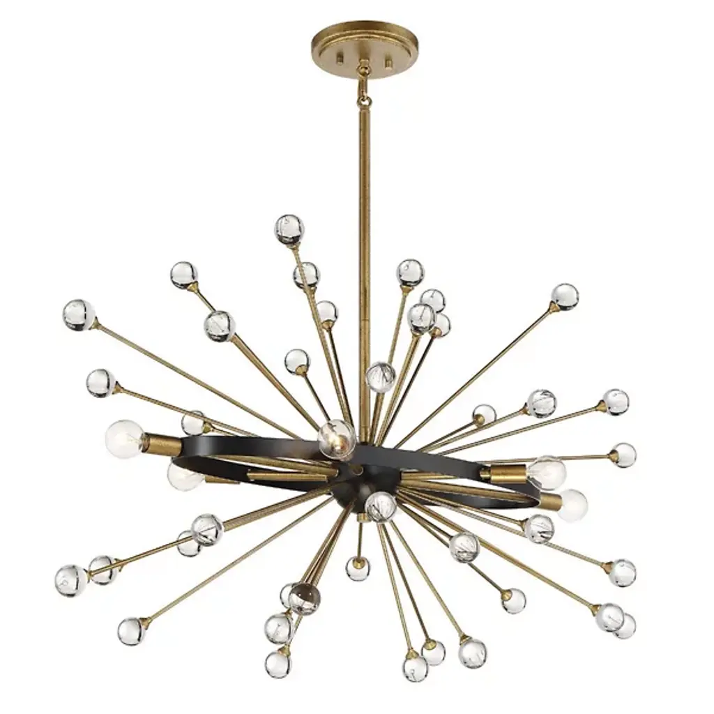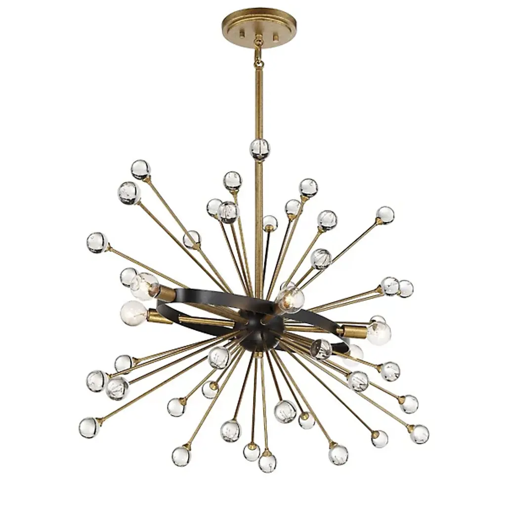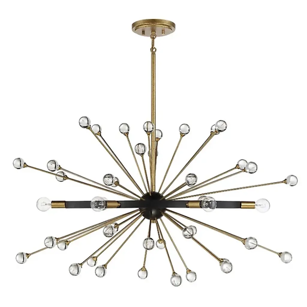 Ultra-stylish and mid-mod inspired. The Ariel Linear Chandelier is a contemporary piece by Savoy House that boasts the classic Sputnik silhouette. It hangs from an adjustable down rod from the canopy to display many slender arms that seem to burst from the center to hold clear crystal shades in a tiny spherical form. They adorn each arm and glow when illuminated. The linear ring is finished in Como black, and the entirety is finished in accents of gold. It’s quite the enchanting way to illuminate a space with something that stands alone as a beautiful work of art before it is even put to practical use.