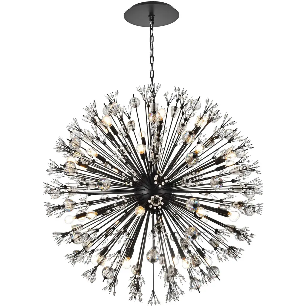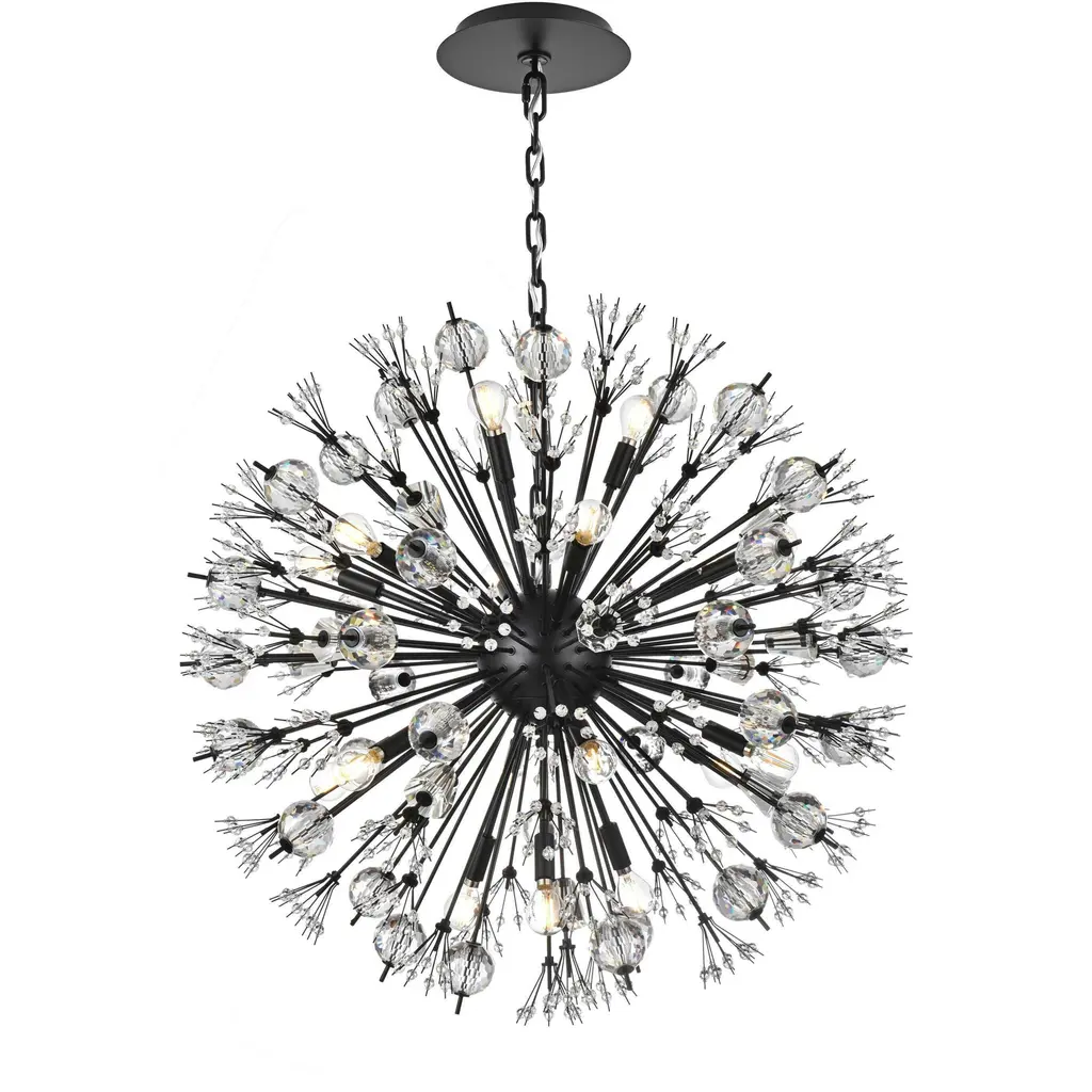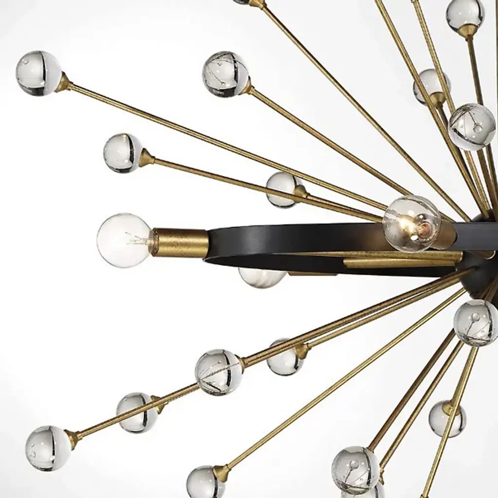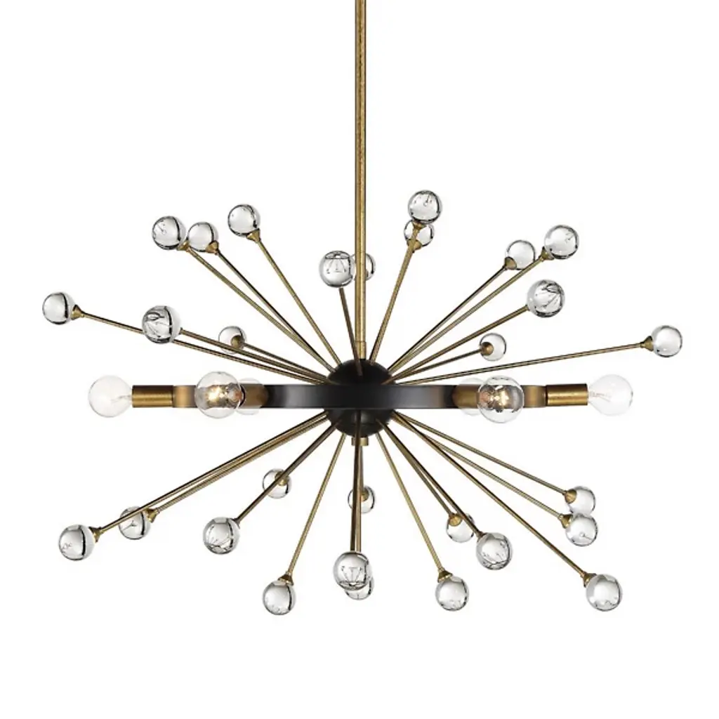 Ultra-stylish and mid-mod inspired. The Ariel Linear Chandelier is a contemporary piece by Savoy House that boasts the classic Sputnik silhouette. It hangs from an adjustable down rod from the canopy to display many slender arms that seem to burst from the center to hold clear crystal shades in a tiny spherical form. They adorn each arm and glow when illuminated. The linear ring is finished in Como black, and the entirety is finished in accents of gold. It’s quite the enchanting way to illuminate a space with something that stands alone as a beautiful work of art before it is even put to practical use.
