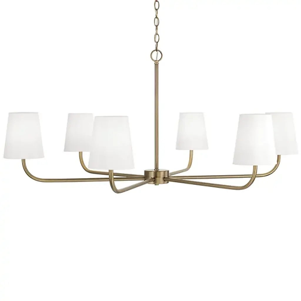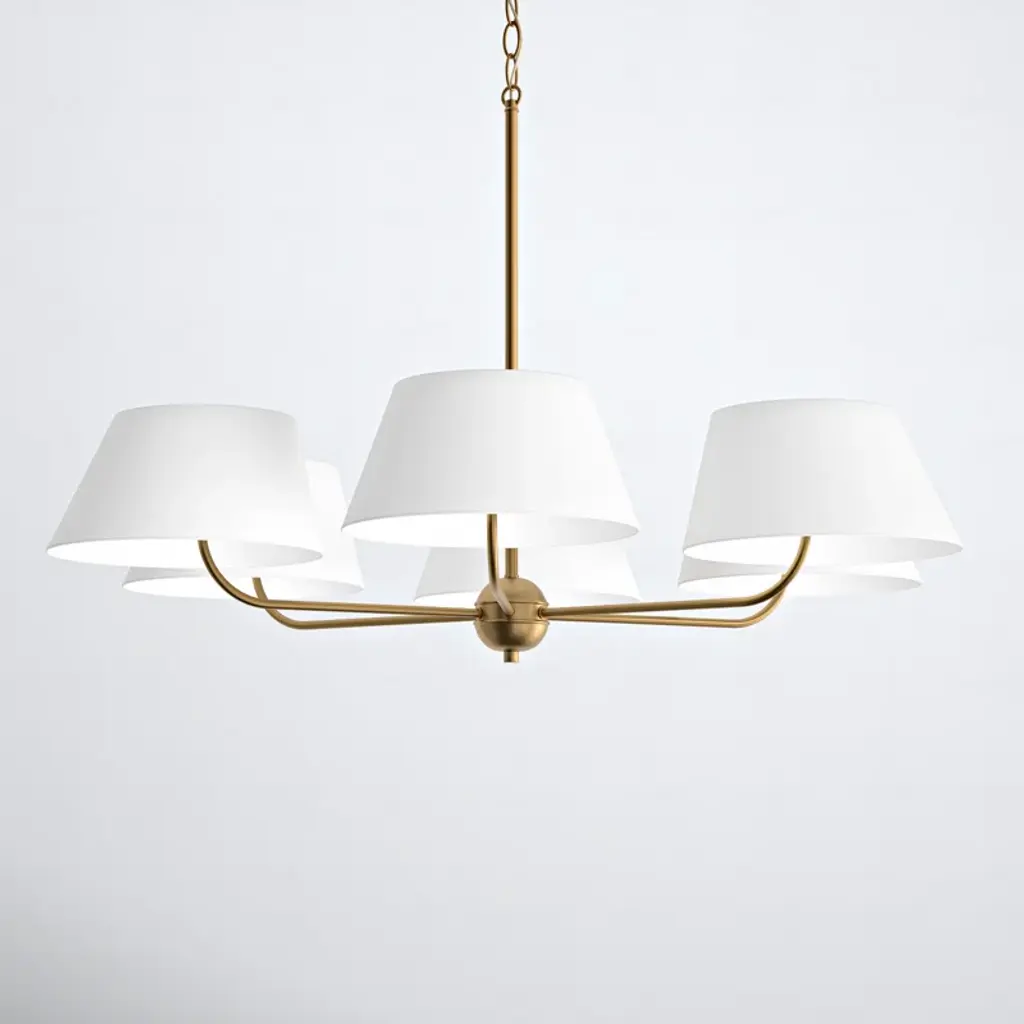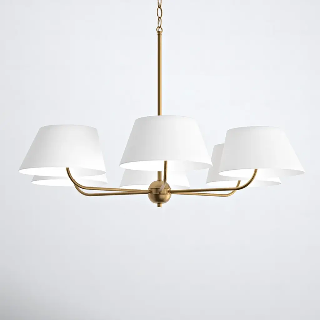 Angled shades create the ultimate sophistication with the Arielle chandelier. The crisp white fabric empire shades get a geometric refresh and complement the warmth of the slender aged brass arms.