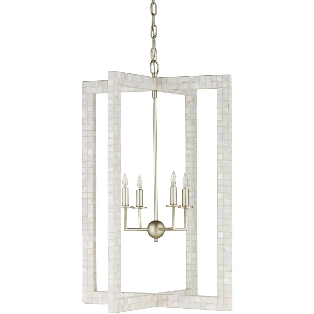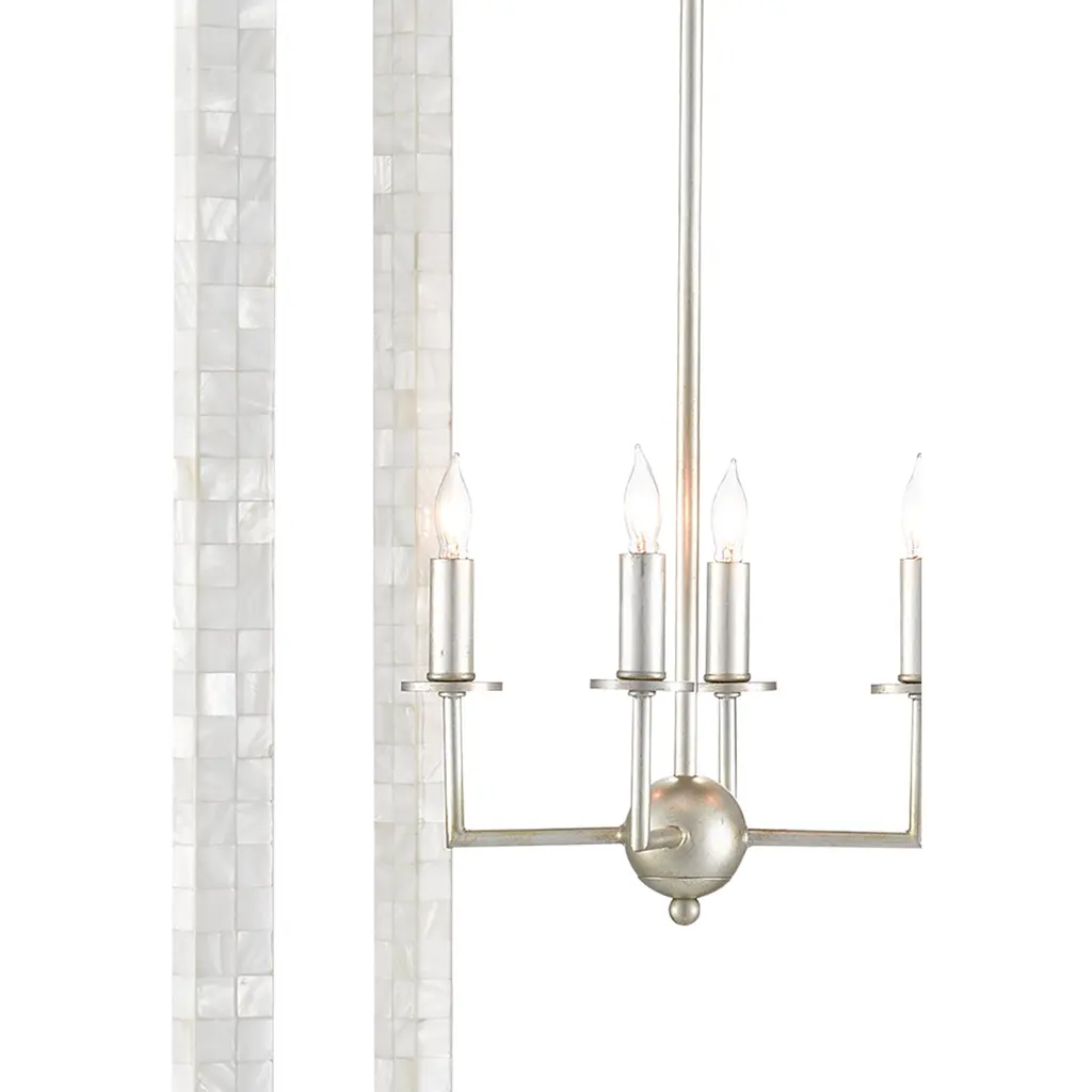 With thin rectangles covered in hand-applied mother-of-pearl mosaic, our Arietta Chandelier is an example of the talent our finish artisans have when it comes to handcrafted surfaces. The metal that has been treated to a contemporary silver leaf finish enhances the glow of the fixture when the four lights illuminate. This is one of our silver chandeliers that will bring an uptick in sophistication to the space it enlivens.