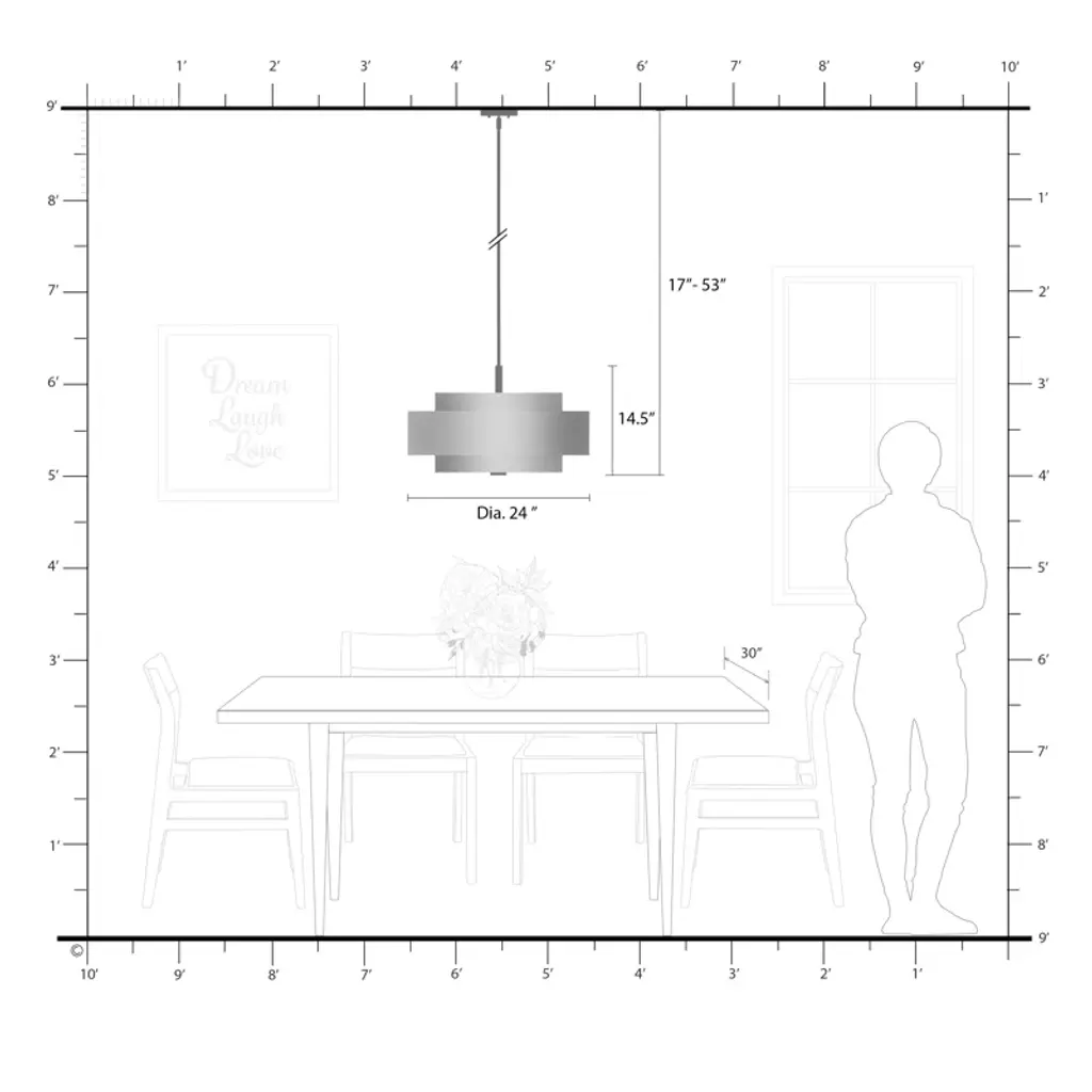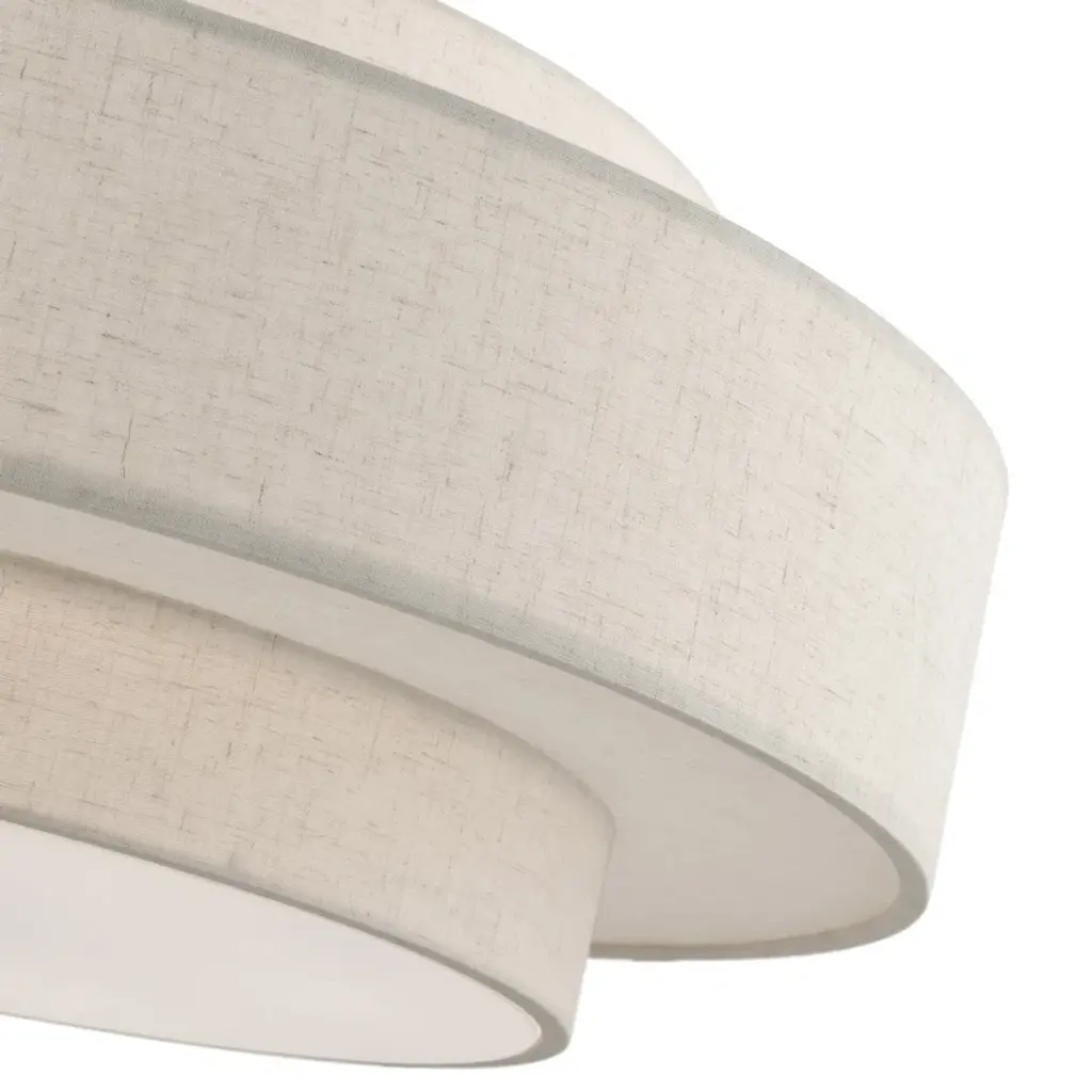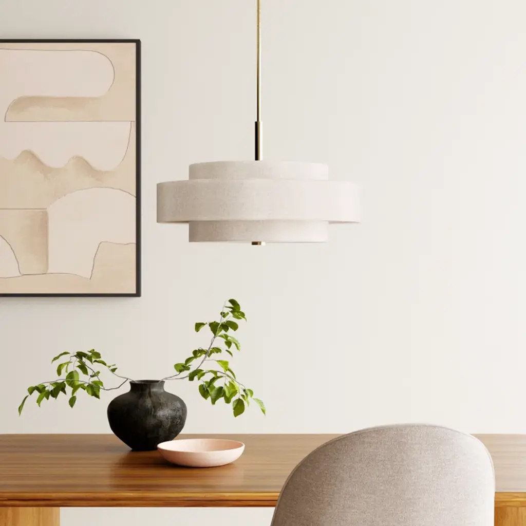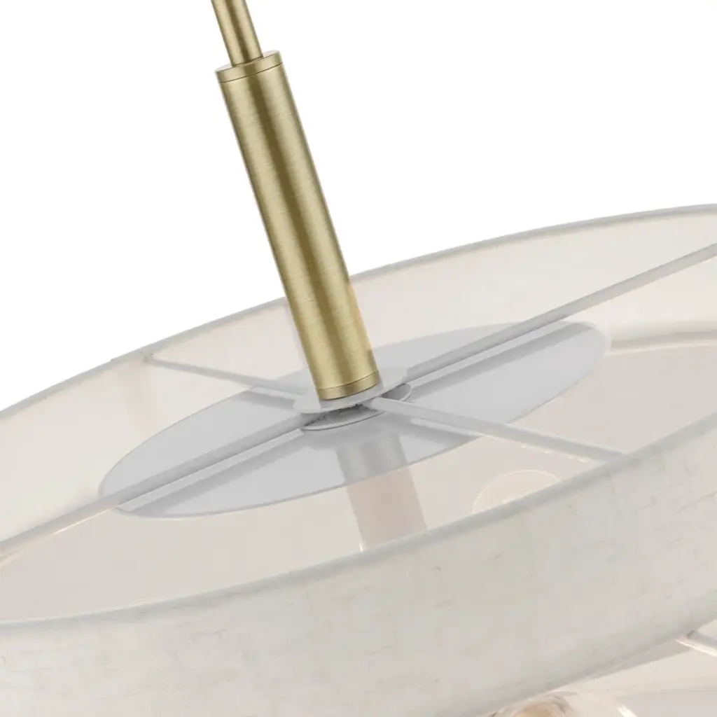 A triple drum shade adds character to this handsomely styled chandelier. Update your decor with the clean styling of this contemporary five-light pendant. Features a lovely hand-crafted oatmeal color fabric hardback shade and satin white acrylic diffuser for subtle illumination.