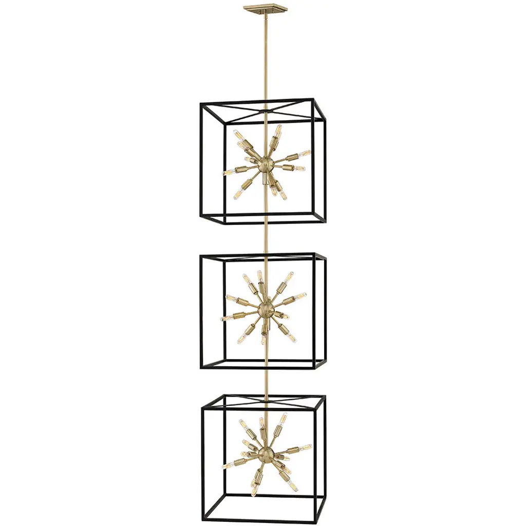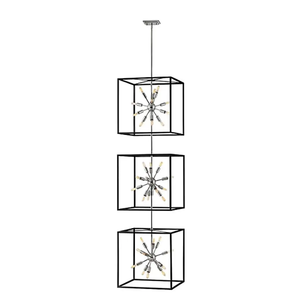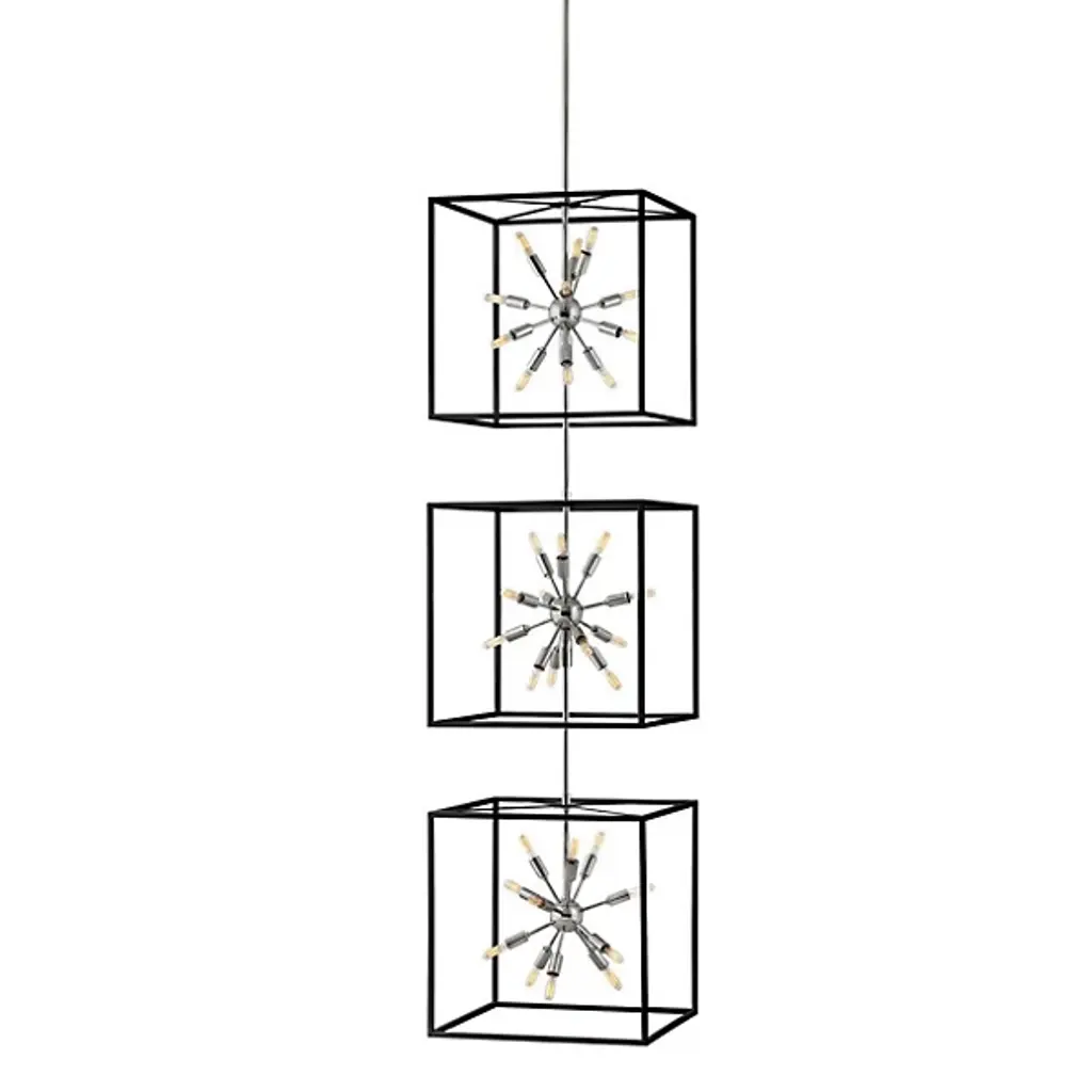 Dazzling and dimensional. The Aros 3-Tier Chandelier by Hinkley is stunning from every angle. It features sputnik-inspired starburst candelabras for a nod to mid-century modern style. Articulating square frames provide geometric interest while allowing for easy rotation to achieve a custom interior lighting design. Perfect suspended from higher or sloped ceilings, in corners or above dining areas, this contemporary light fixture can be adjusted to hang at the desired height.