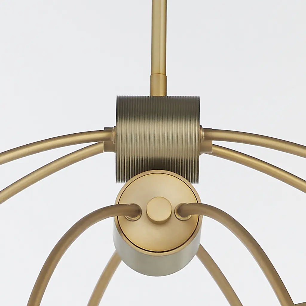 The Arpeggio collection features modern pendant light fixtures with a sleek, contemporary design. Rods extend down to a duo of cylinders from a circular mounting plate. Eight curved arms extend downwards from the central piece, each ending in a satin opal glass shade that houses a candelabra socket. The overall style combines elements of industrial and minimalist aesthetics. Choose from matte black or aged brass finishes.