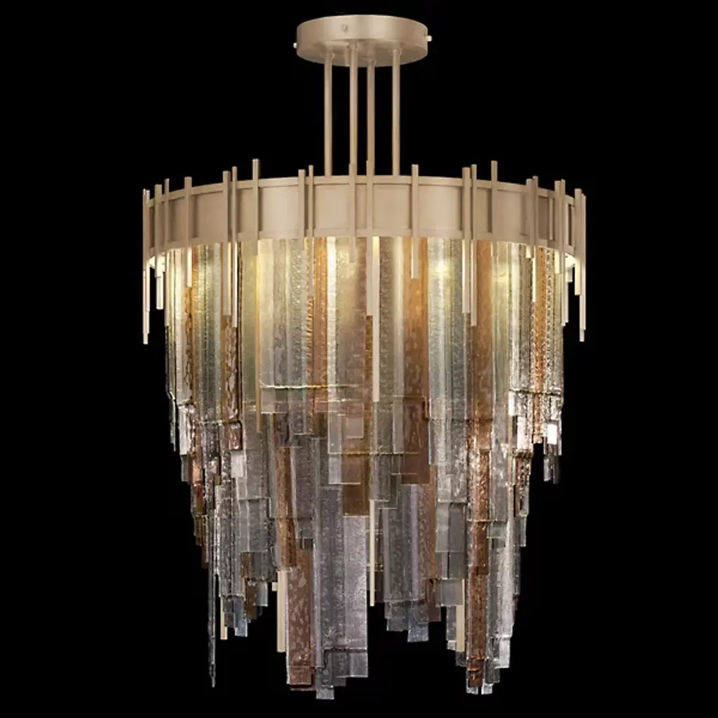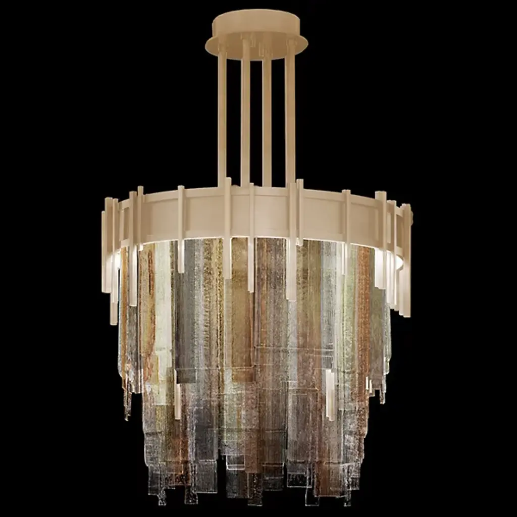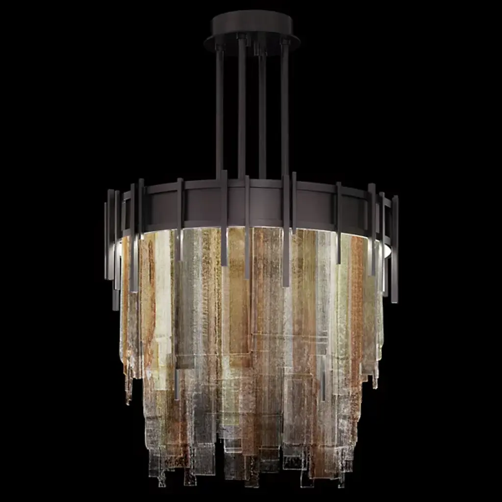 The Arpeggio LED Chandelier from Fine Art composes a dynamic visual rhythm of light. Drawing influence from jazz and demonstrating classic Art Deco style, this large, bold fixture layers hand-fused studio glass in clear and colored tones emerging from a broad ringed collar, suspended beneath a structured canopy. Each panel is arranged at varying heights to evoke movement and flow, while integrated LED lighting adds a soft, ambient glow. Bold yet refined, it brings sophistication and warm harmony to open areas and grand entryways.