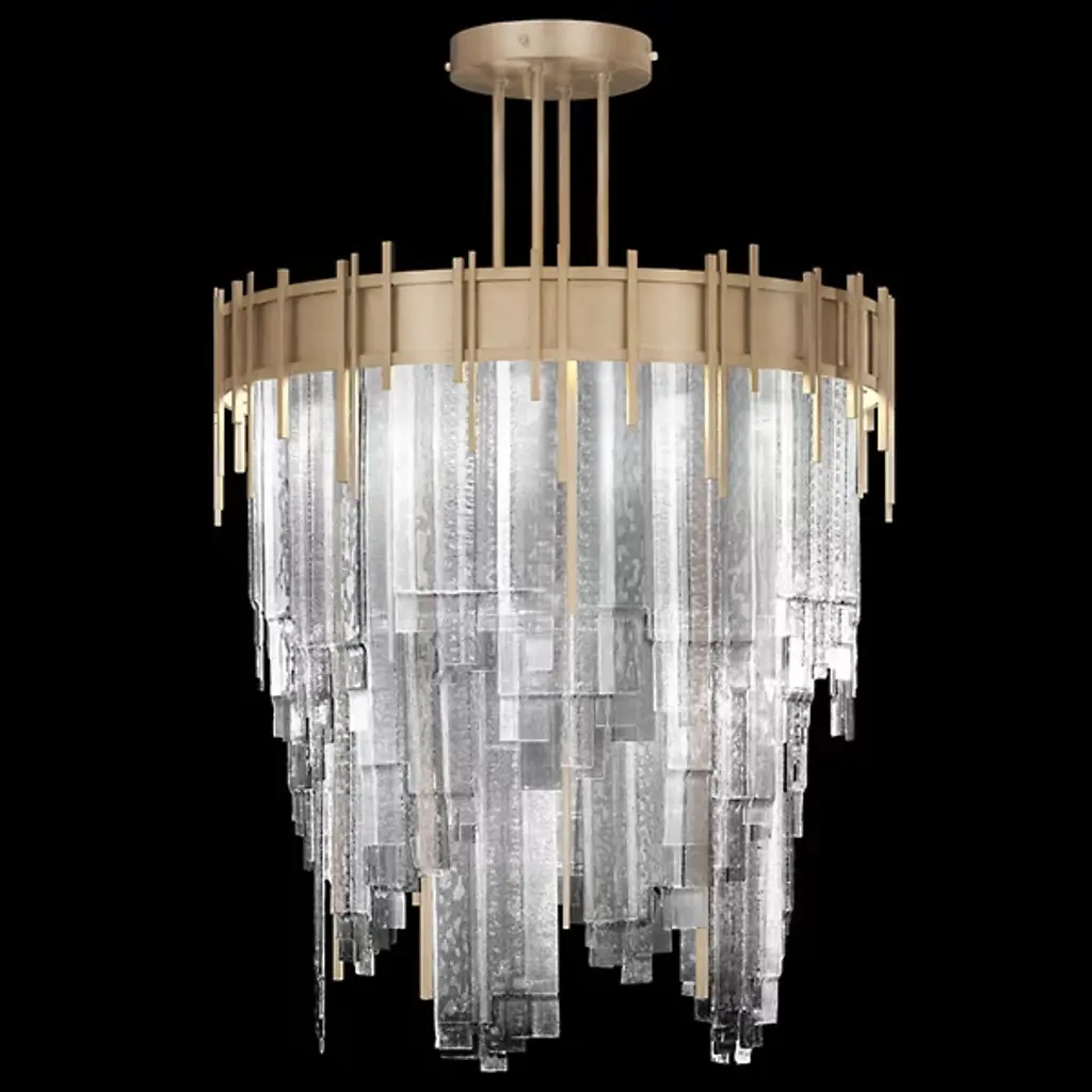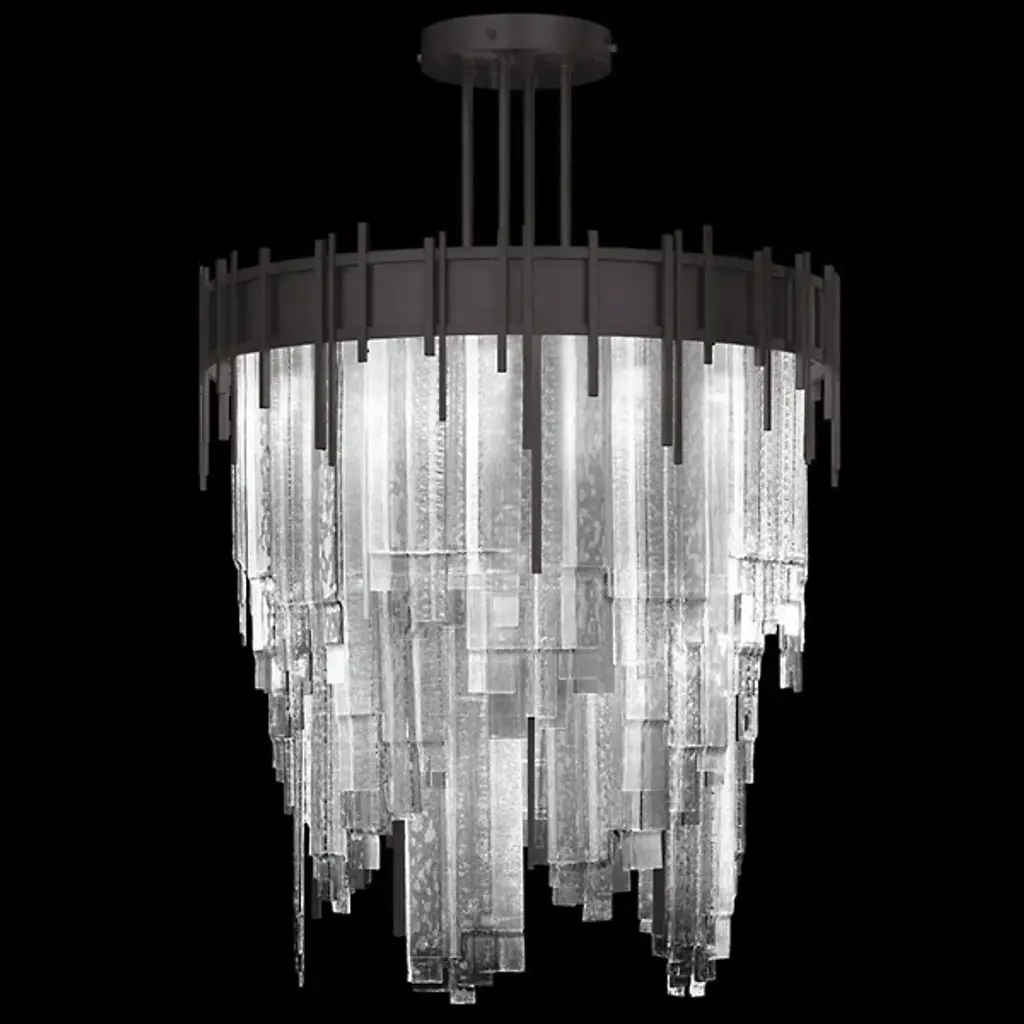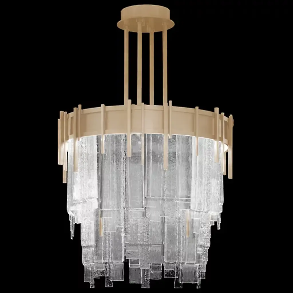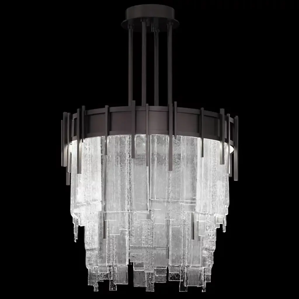 The Arpeggio LED Chandelier from Fine Art composes a dynamic visual rhythm of light. Drawing influence from jazz and demonstrating classic Art Deco style, this large, bold fixture layers hand-fused studio glass in clear and colored tones emerging from a broad ringed collar, suspended beneath a structured canopy. Each panel is arranged at varying heights to evoke movement and flow, while integrated LED lighting adds a soft, ambient glow. Bold yet refined, it brings sophistication and warm harmony to open areas and grand entryways.