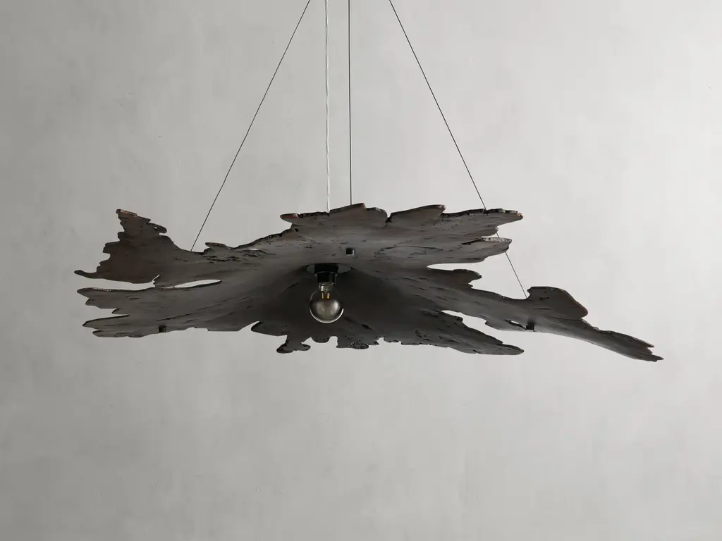 Celebrate the natural beauty of raw materials with our Arruga Collection, featuring salvaged milpa wood with every organic crack and grain pattern on display. Our imaginative artisan partners in Mexico slice the wood and leave them out in the sun to dry, creating the natural dome shape. Paired with matte black hardware and a unique metallic dipped bulb, Arruga is a showstopper for any space.