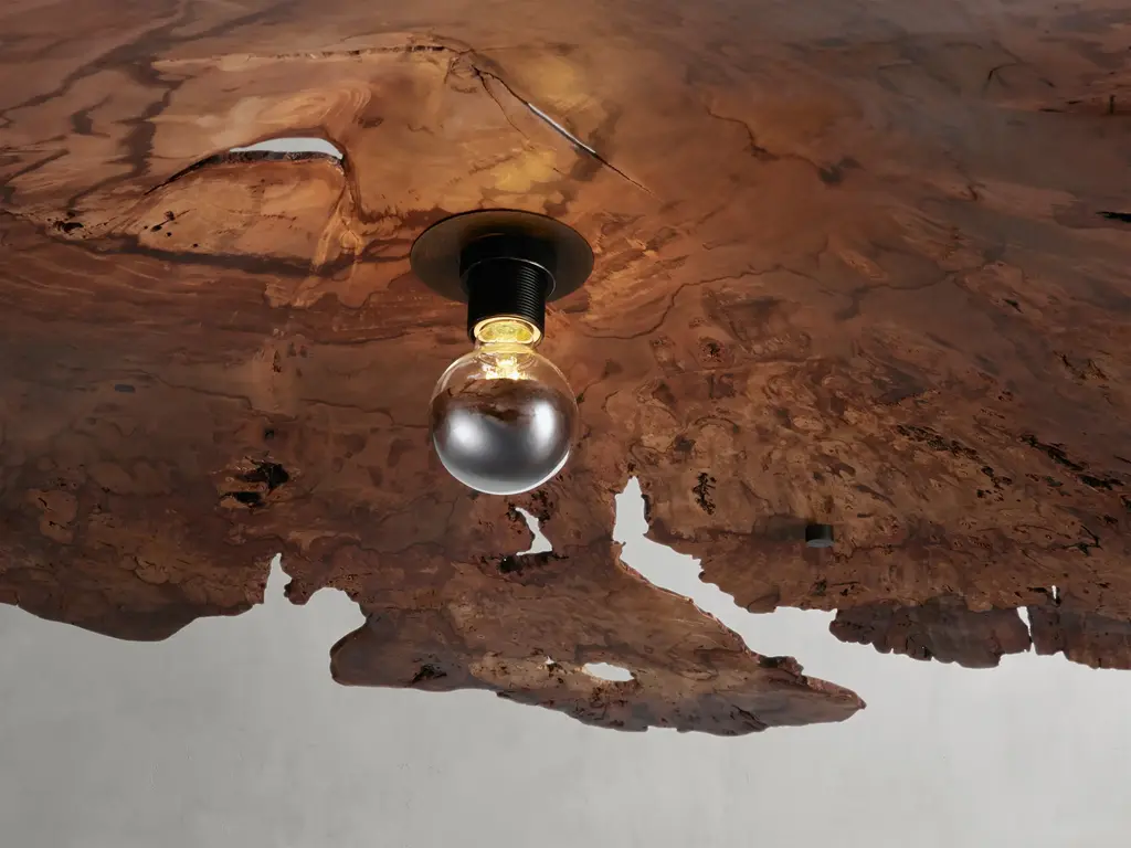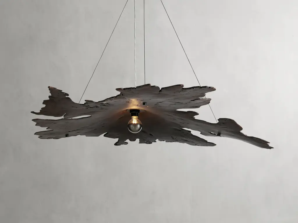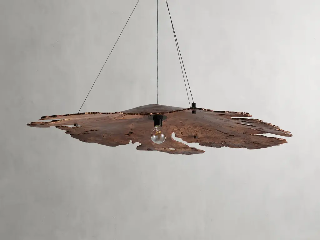 Celebrate the natural beauty of raw materials with our Arruga Collection, featuring salvaged milpa wood with every organic crack and grain pattern on display. Our imaginative artisan partners in Mexico slice the wood and leave them out in the sun to dry, creating the natural dome shape. Paired with matte black hardware and a unique metallic dipped bulb, Arruga is a showstopper for any space.