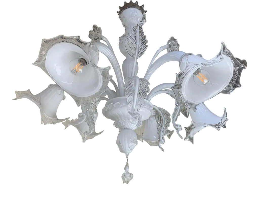 The Arsenale Chandelier by Mazzega 1946 is a beautiful design that brings a fresh take on the classic Venetian chandelier to spaces. This hand-worked glass design displays a series of bulbs around its form, cradling them in decorative cups at the ends of shapely, graceful arms that reach out from a central bowl that textural leaves and flowers bloom from. Soft shapes and thoughtful detailing add to the overall look of this striking, statement-worthy piece as its delicate and romantic nature bring a bright, artful touch to rooms.