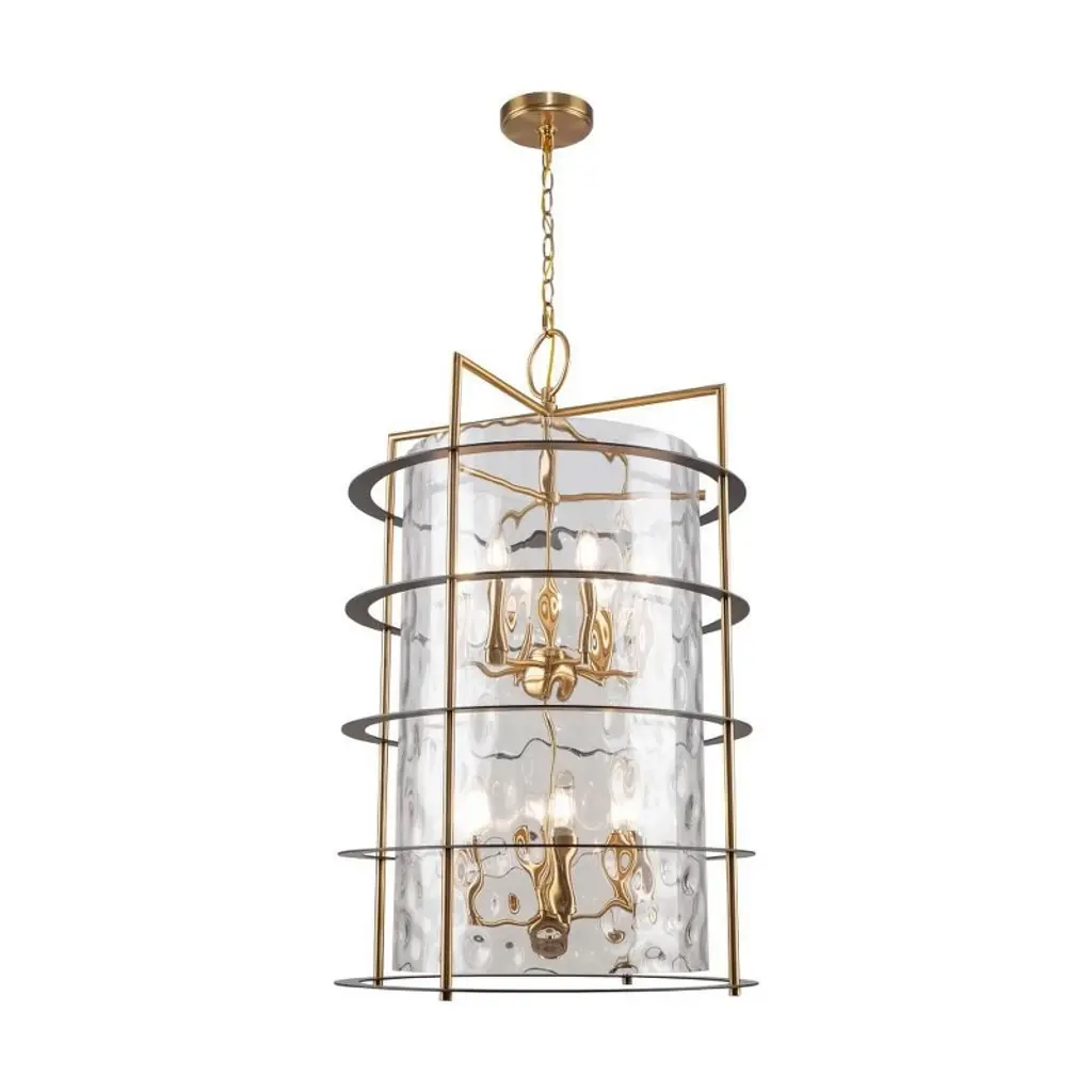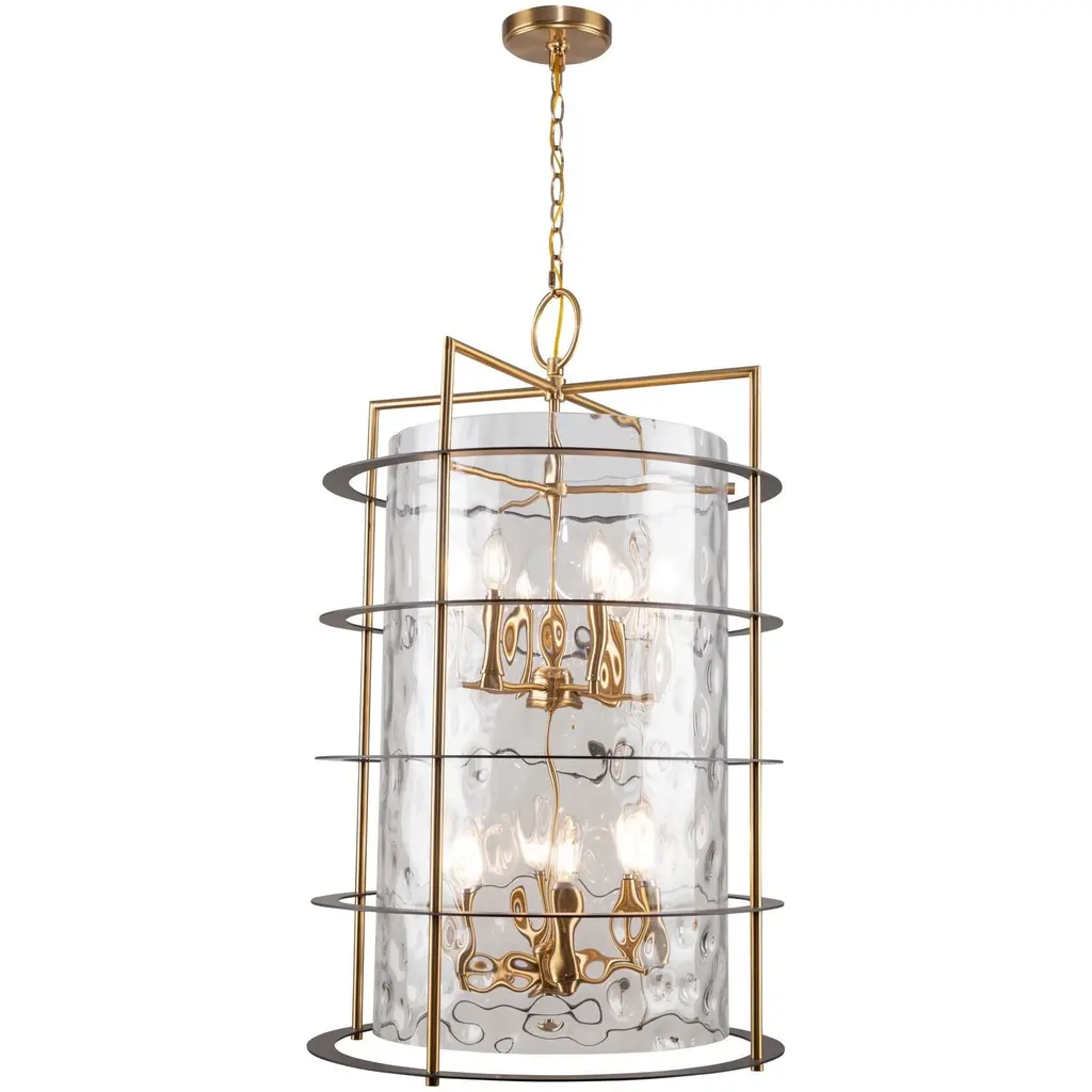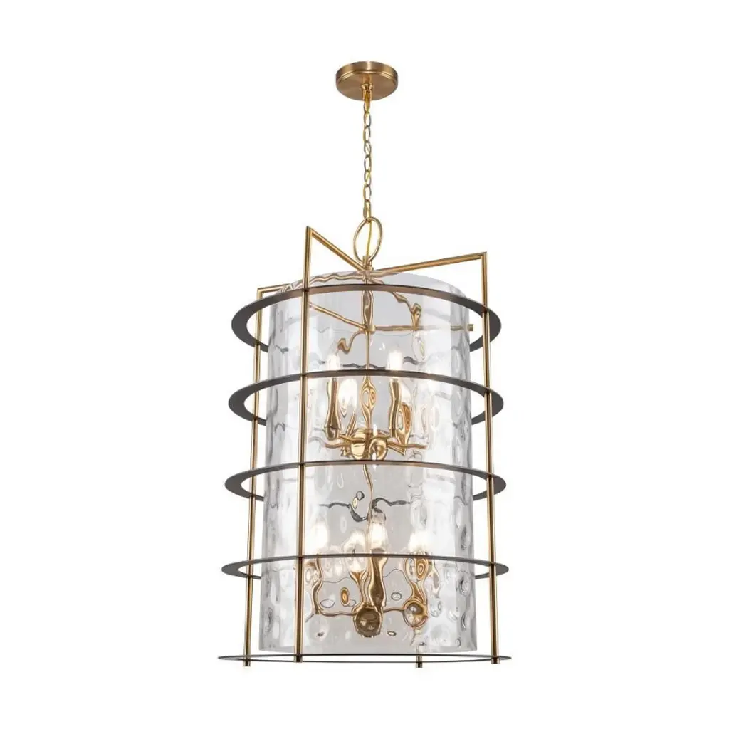 The Buford Collection is a striking ensemble that seamlessly blends elegance and modern design. Its defining features include a brass frame complimented with black rings, creating a contemporary contrast against the timeless appeal of the metal. The thick semi-transparent water glass add opulence and warmth, making these lanterns style chandeliers a sophisticated focal point for any space. 12 light lantern style chandelier for entrance, staircase, or foyer (height adjustable and compatible with sloped ceilings). Brass & Black finish / Dimmable / 12 x bulb base required (bulbs not included) / Adjustable hanging height / ETL listed / Limited lifetime warranty / Sloped ceiling compatible. ,