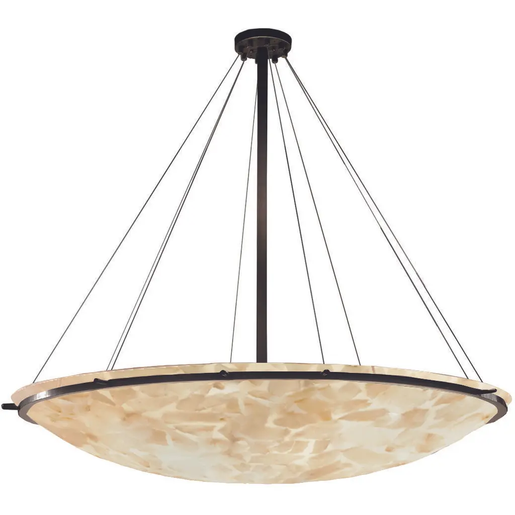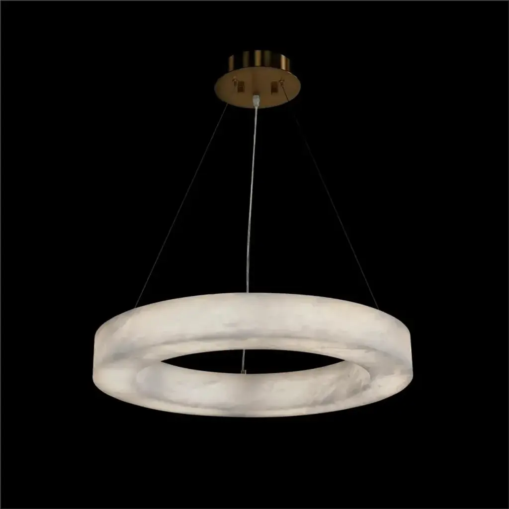 Hanging gracefully from the ceiling, the Camila collection exudes an ethereal glow, casting a soft and warm ambiance. Its meticulously carved alabaster diffuses the light in an elegant dance of shadows, creating a captivating interplay of textures. The chandelier's seamless design and timeless beauty make it a focal point, blending sophistication with a touch of celestial charm. 19" diameter ring type LED chandelier shown. (height adjustable via push pin cables) Brushed Brass finish / Dimmable / Integrated LED / ETL listed / Limited lifetime warranty / Sloped ceiling compatible / Room location: dining room. ,