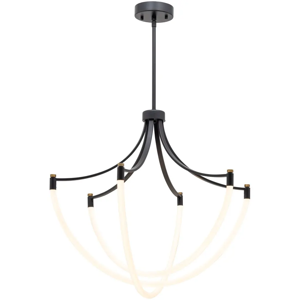 The Cascata Collection, designed by Kevin Kraemer, features a sleek and minimalist design, combining precision craftsmanship with modern aesthetics. The frame is black with brass accents. The bright LED illuminated silicone drapes throughout giving this collection an illusion of weightlessness. This eye-catching collection is a perfect complement to any surrounding. The model shown is a height adjustable circular chandelier. Kevin Kraemer design / Black and Brushed Brass finish / Dimmable / Integrated LED / Adjustable hanging height / ETL listed / Limited lifetime warranty. ,