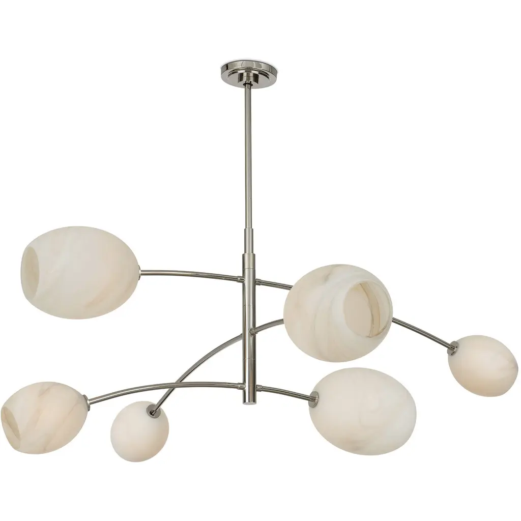Artemis blends sleek design with the allure of artisan-crafted glass. Its open-ended Alabaster-like glass globes add moody sophistication, creating a captivating and unique ambiance. Inspired by the concept of a mobile, Artemis features gracefully balanced arches in a natural brass finish, making it both a functional light source and a stunning piece of modern art.