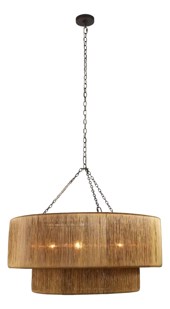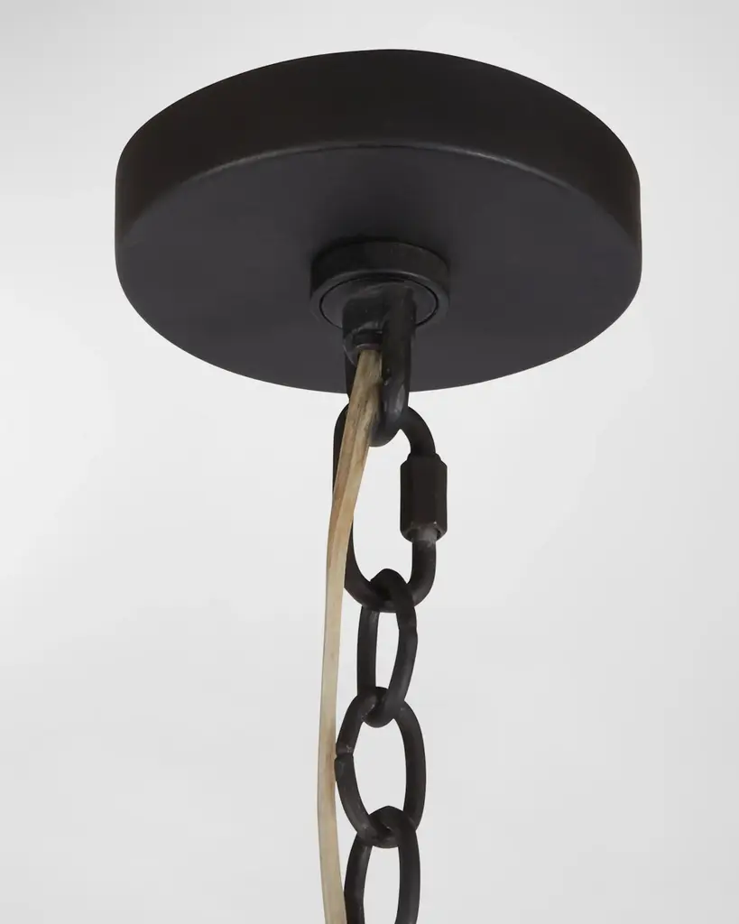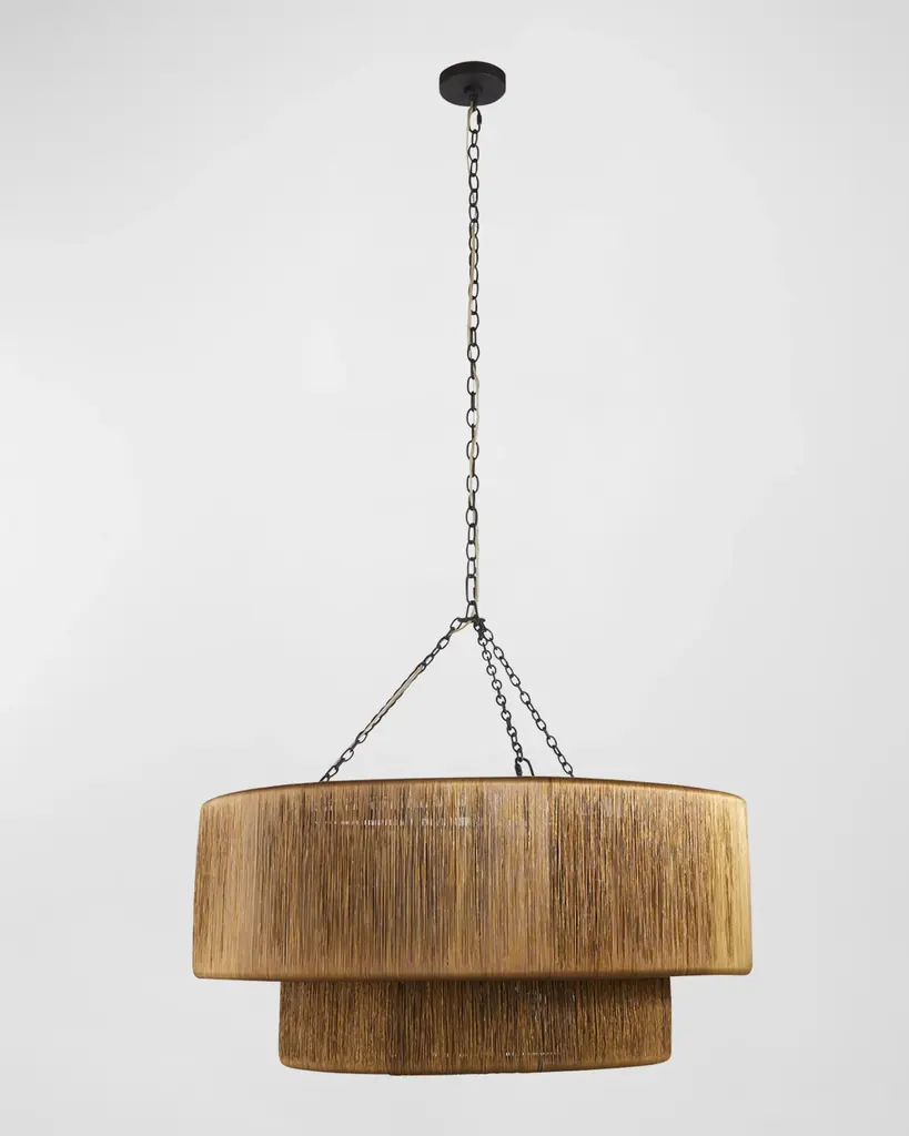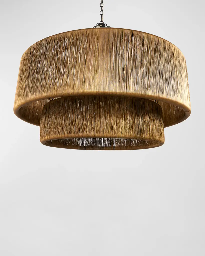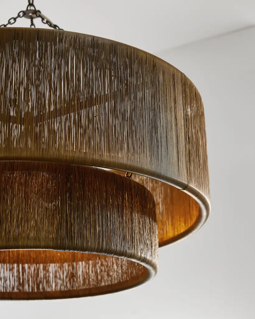 A waterfall of wrapped vintage brass wire adds a luxurious accent to a traditional tiered drum shade. Suspended from blackened iron chains, this handmade fixture hides three clear bulbs that deliver a glimmering, always flattering illumination. Handcrafted of brass and iron Uses three 60-watt Type A E26 bulbs Overall, approx. 32"T x 35"Dia. Canopy, 1"T x 5"Dia. Hanging height, 32-66" Cord length: 10 ft. Professional installation recommended; hanging hardware not included UL listed Weight, 61.0 lbs Imported Boxed weight, approximately 69.5lbs Shipping Direct from Vendor, usually ships within 60 business days. Backed by a limited manufacturer’s warranty. ( Click here for warranty information ) About Arteriors: For more than 30 years, Arteriors' pursuit of extraordinary product design, impeccable style, and artisanal quality craftsmanship have built their foundation as a premier resource within the lighting, furniture, wall décor, and decorative accessory categories. Arteriors continues to evolve their product offering, forming objects of perfect proportion and scale, resulting in bold interiors, influenced by art, architecture, and fashion. Every design is a unique statement of their commitment to bring art to every story, and a story to every interior.