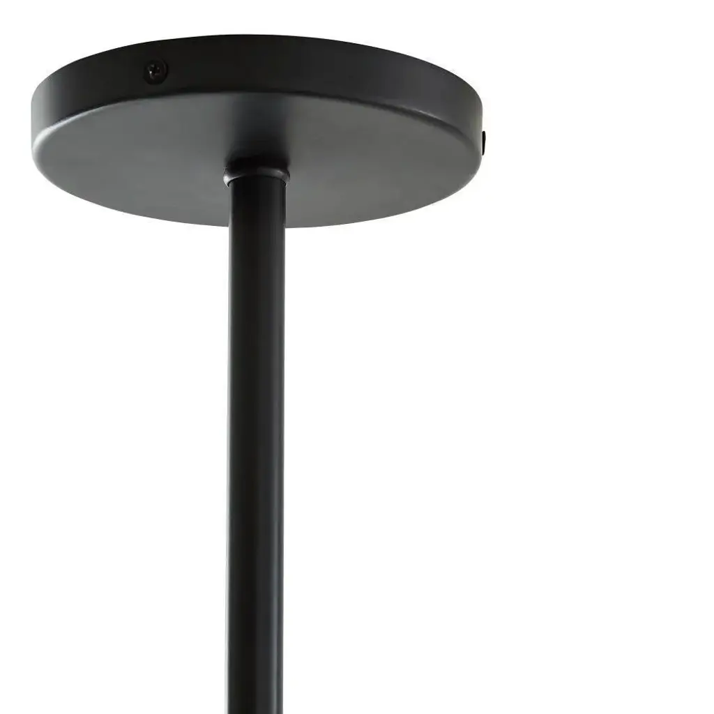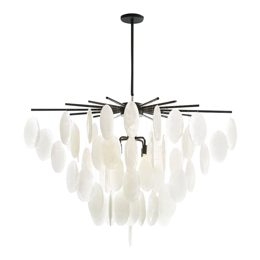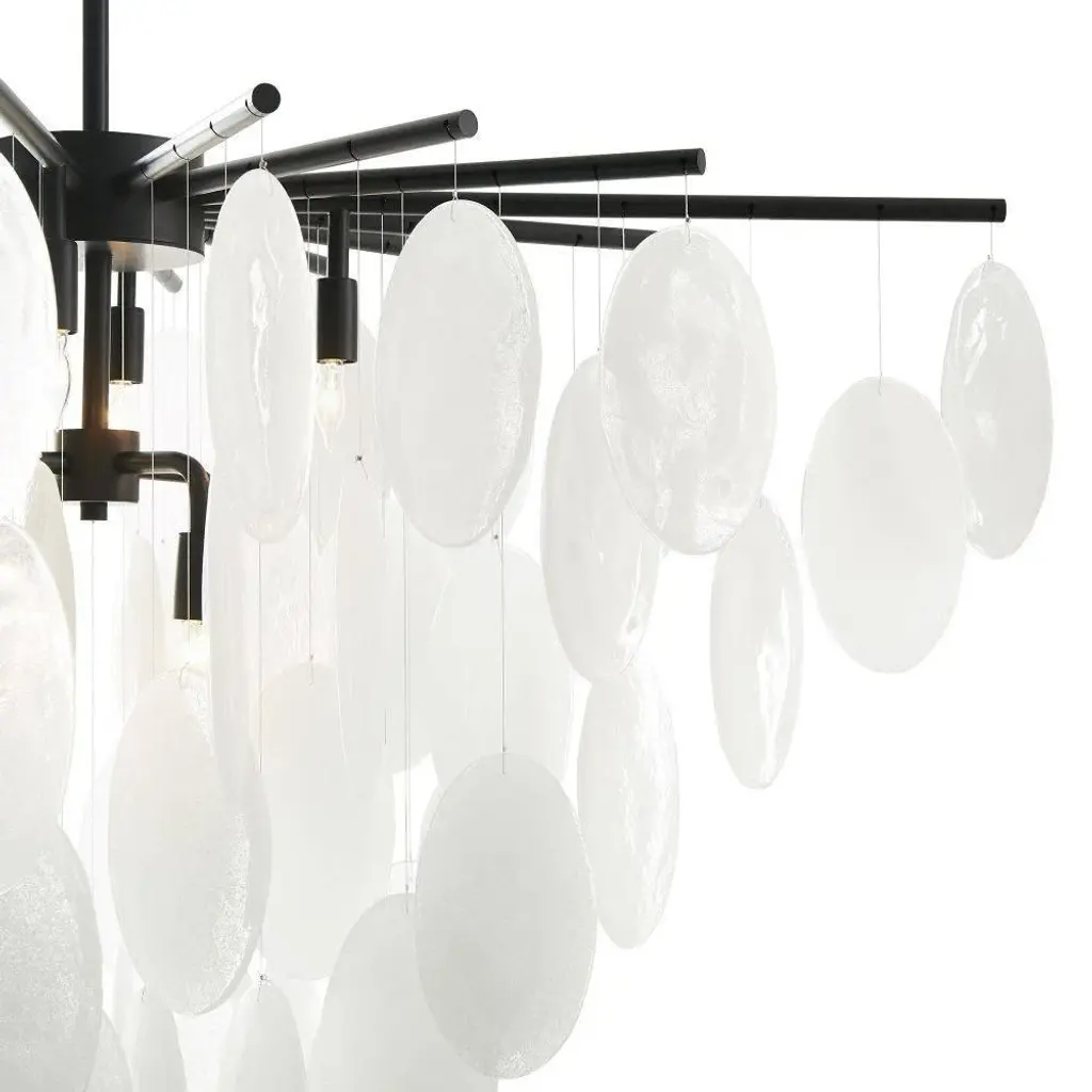 This eight-light chandelier is slightly whimsical. Frosted, seedy glass discs bring a modern feel to this stunning wind chime design. A blackened iron frame anchors the piece while adding a hint of industrialism. Finish may vary. Shown with a clear tubular bulb. Additional pipe available (PIPE-157). Damp-rated, although limited covered outdoor areas may affect finish.