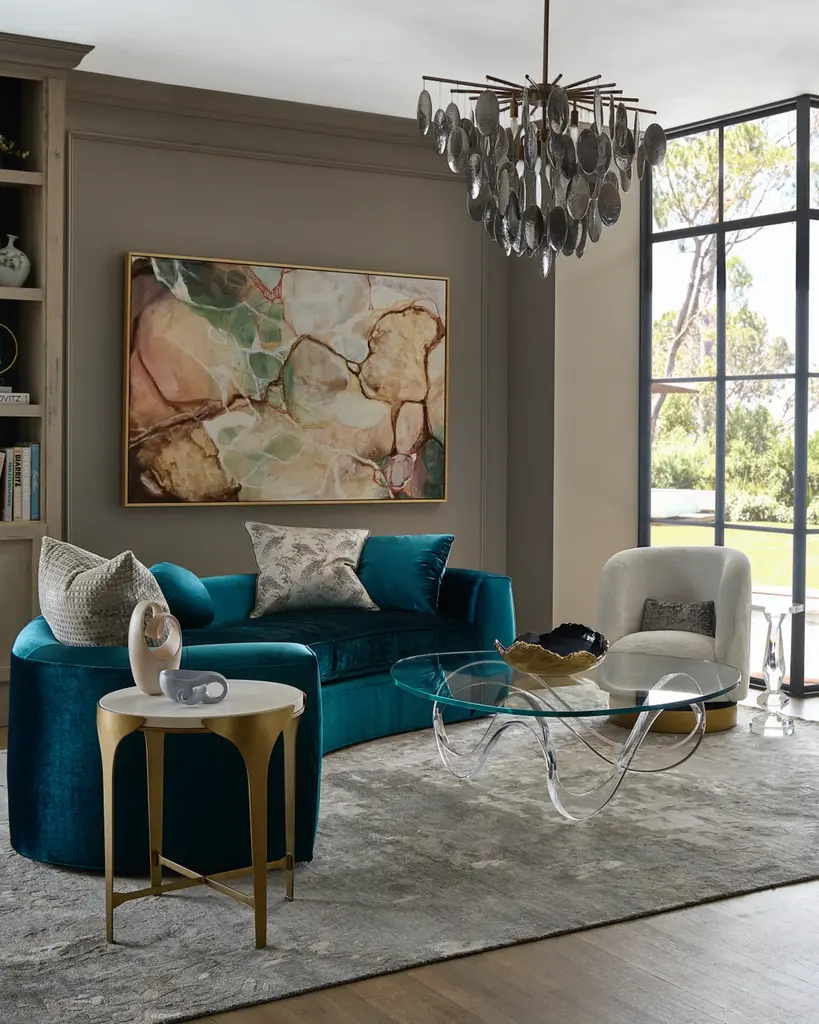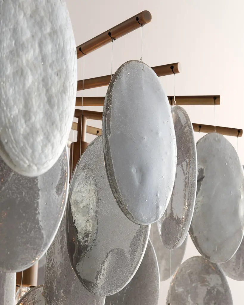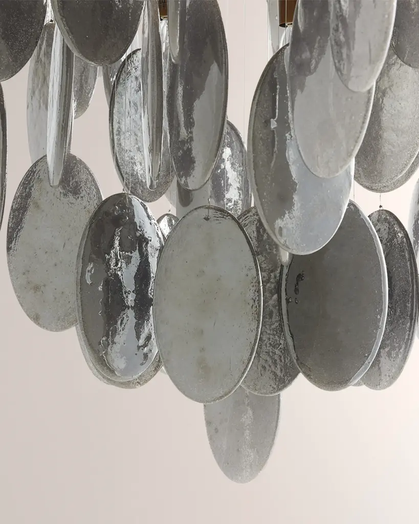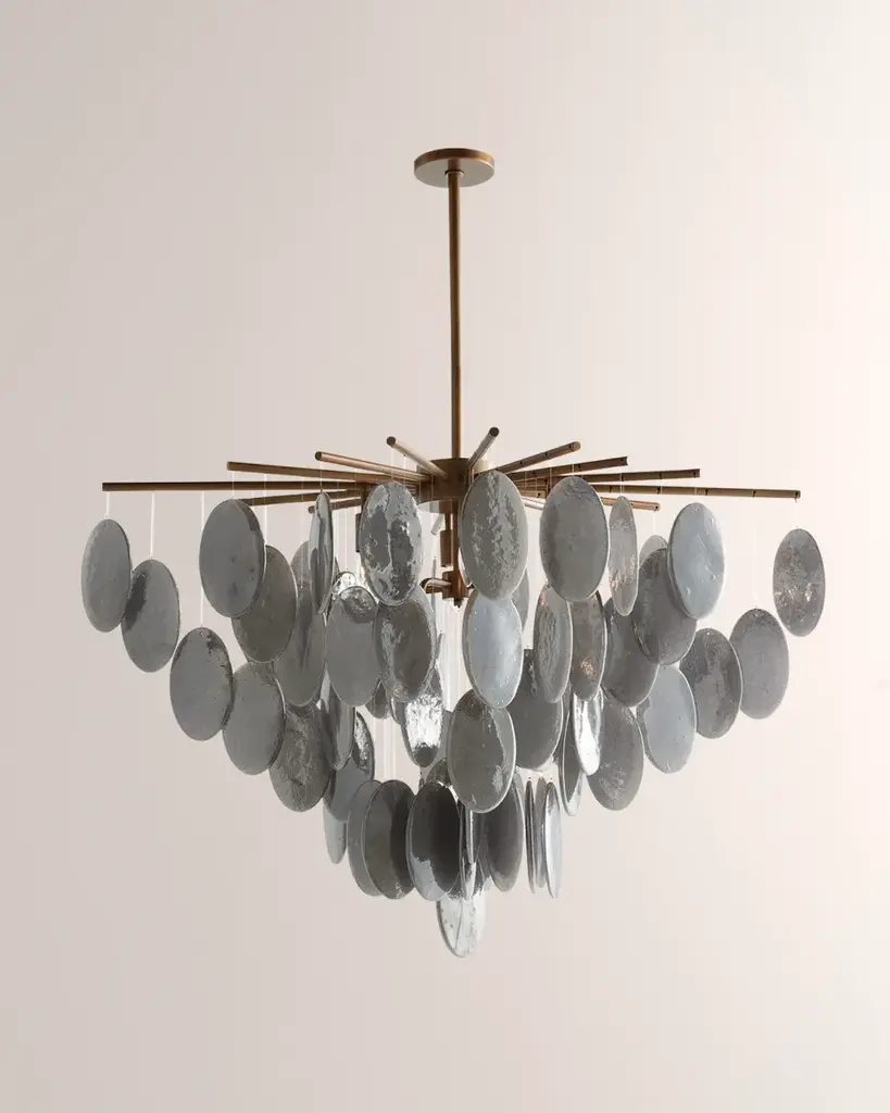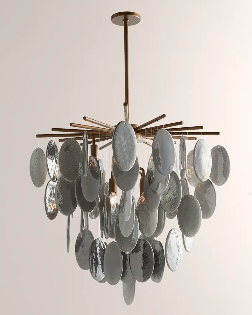 This eight-light chandelier is slightly whimsical. Smoke-luster glass discs bring a modern feel to this stunning wind chime design. An antique brass iron frame anchors the piece while adding a hint of industrialism. Designed by Jay Jeffers Uses (8) 60-watt E12 bulbs Made of glass and steel Overall, approx. 38"T x 42"W x 30"D Canopy, 1"T x 5"Dia. Min. hanging height, 38" Max. hanging height, 62" Includes one 6" and two 12" rods to adjust the height Cord length: 10 ft. UL listed Includes hanging hardware Professional installation recommended Weight, 74.0lbs Imported Boxed weight, approximately 105lbs. Shipping Direct from Vendor, usually ships within 10 business days. About Arteriors: For more than 30 years, Arteriors' pursuit of extraordinary product design, impeccable style, and artisanal quality craftsmanship have built their foundation as a premier resource within the lighting, furniture, wall décor, and decorative accessory categories. Arteriors continues to evolve their product offering, forming objects of perfect proportion and scale, resulting in bold interiors, influenced by art, architecture, and fashion. Every design is a unique statement of their commitment to bring art to every story, and a story to every interior.
