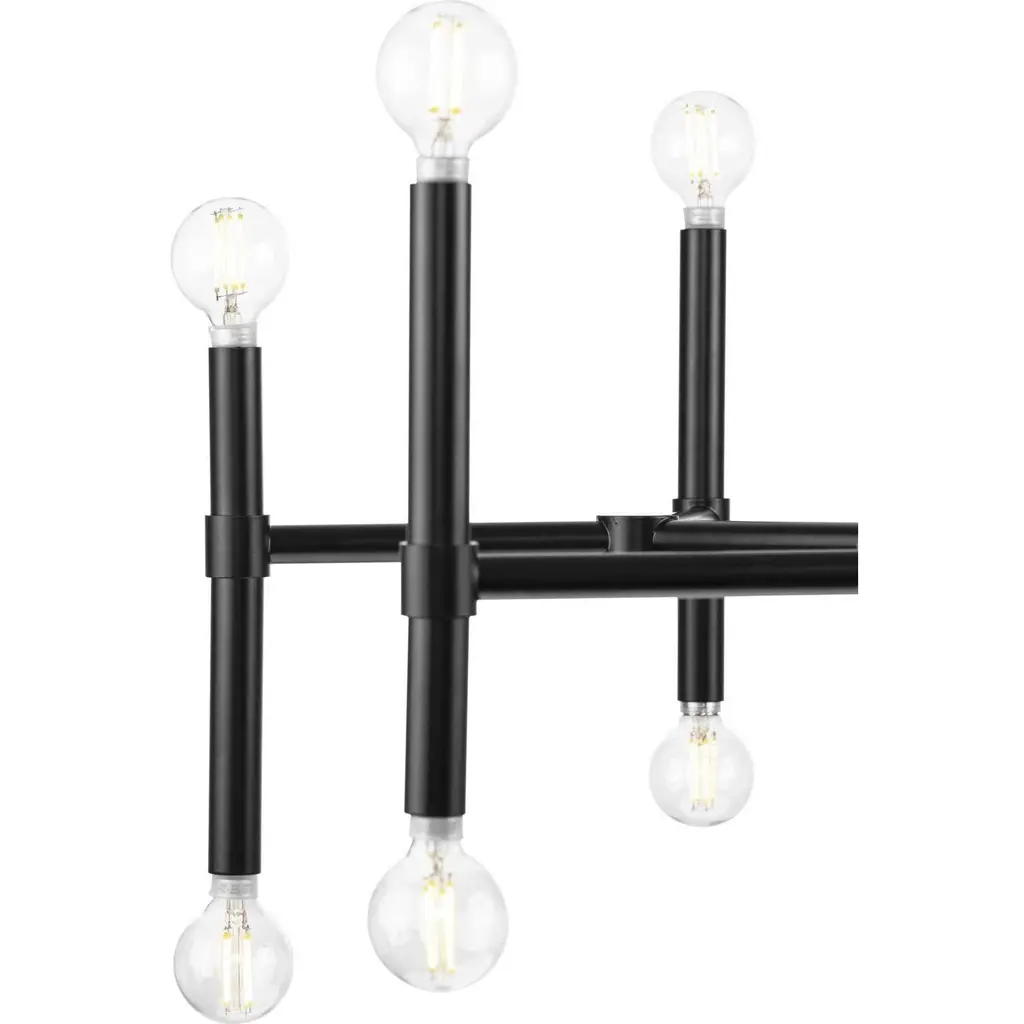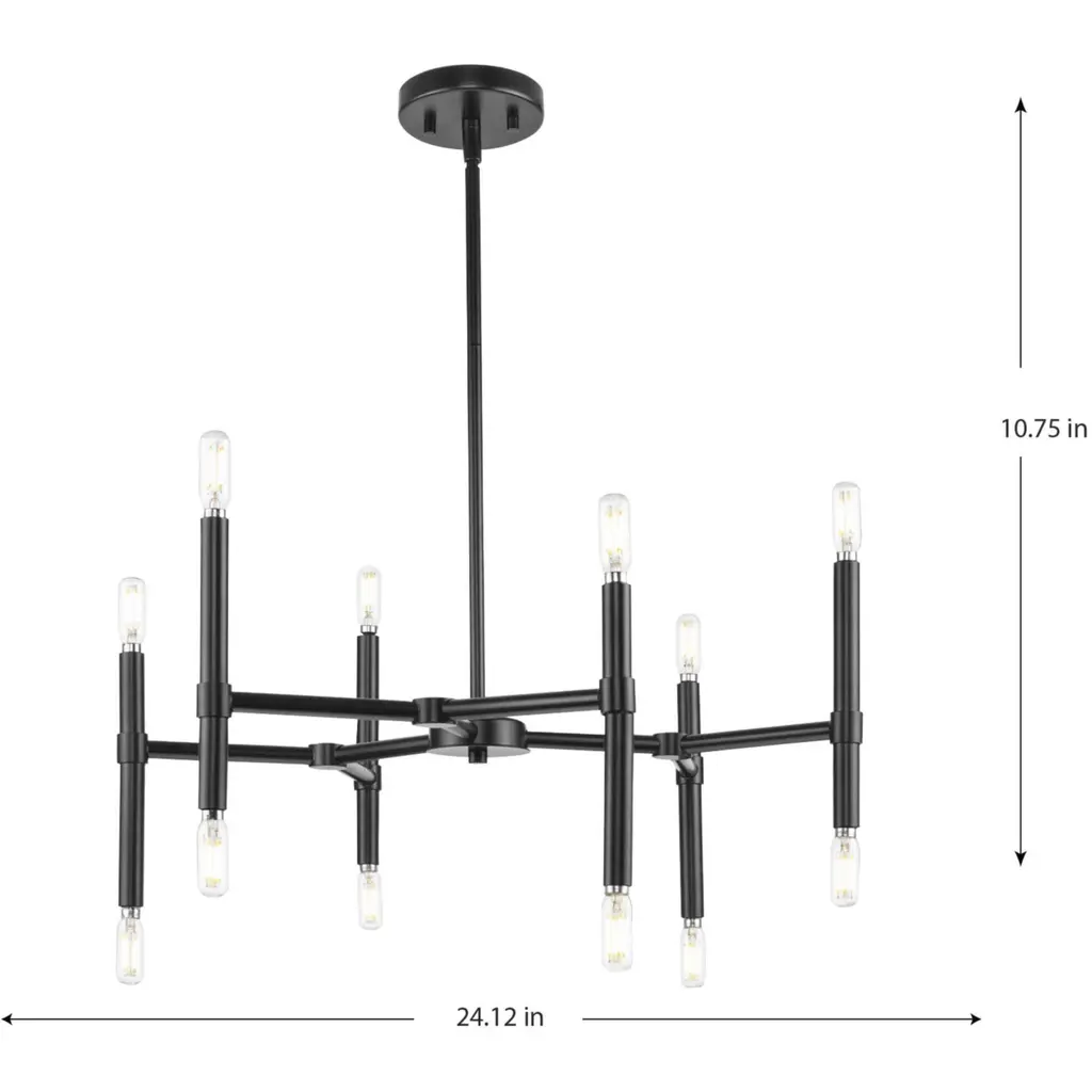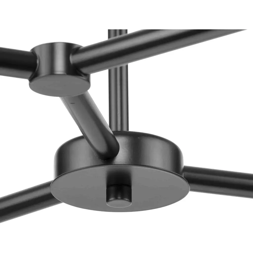 The Arya Collection has a lively essence created by the rhythm of slender, graceful features. The style offers modern appeal with understated elegance.Staggered arms coated in an elegant matte black are suspended from a central axis, defining this bold architectural form. The impressive chandelier brings a modern flair to ceilings in dining rooms, bedrooms and living rooms in luxe, mid-century modern and contemporary settings. This fixture is part of the Progress Lighting Design Series, a lighting collection offering fashionable styles and affordable luxury lighting for the home.