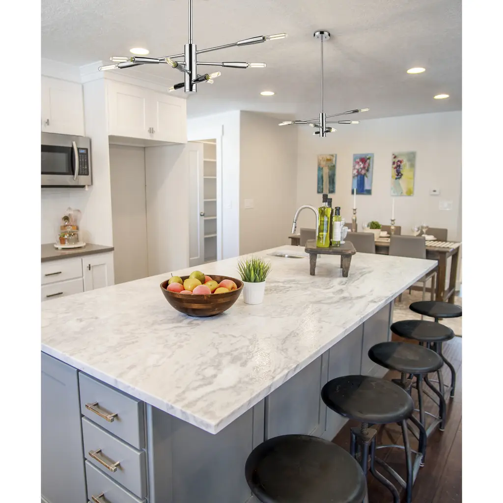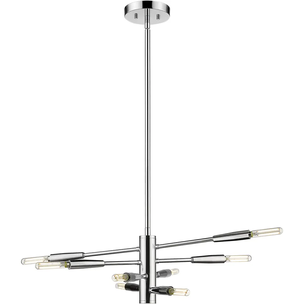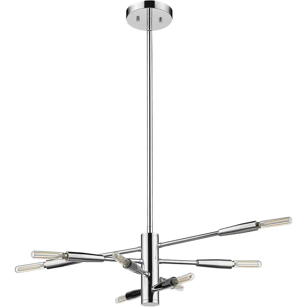 The modernistic aesthetic of space sneaks in to add a dynamic vibe to this chic eight-light chandelier from the Ascension collection. Make any space a central focus with a fixture crafted of brilliant chrome finish steel and dressed up with slender baton-style arms that may be rotated to achieve a customized look. This chandelier is a superb addition to both casual and semi-formal contemporary spaces.