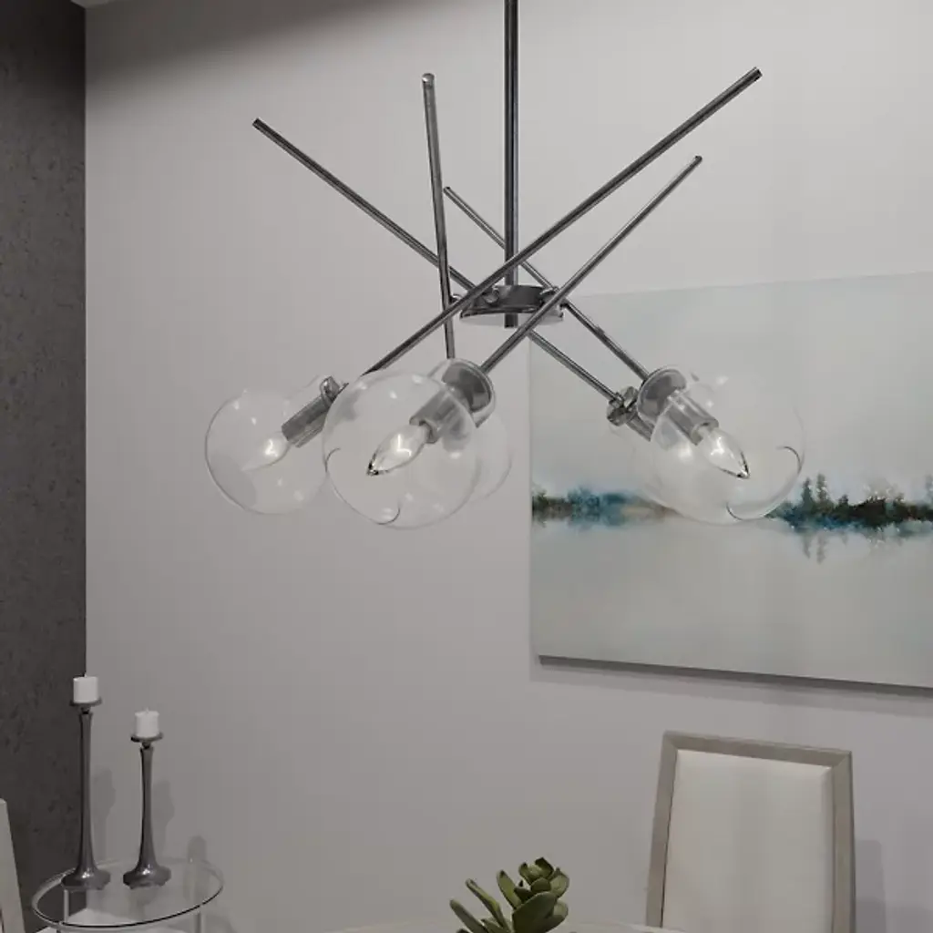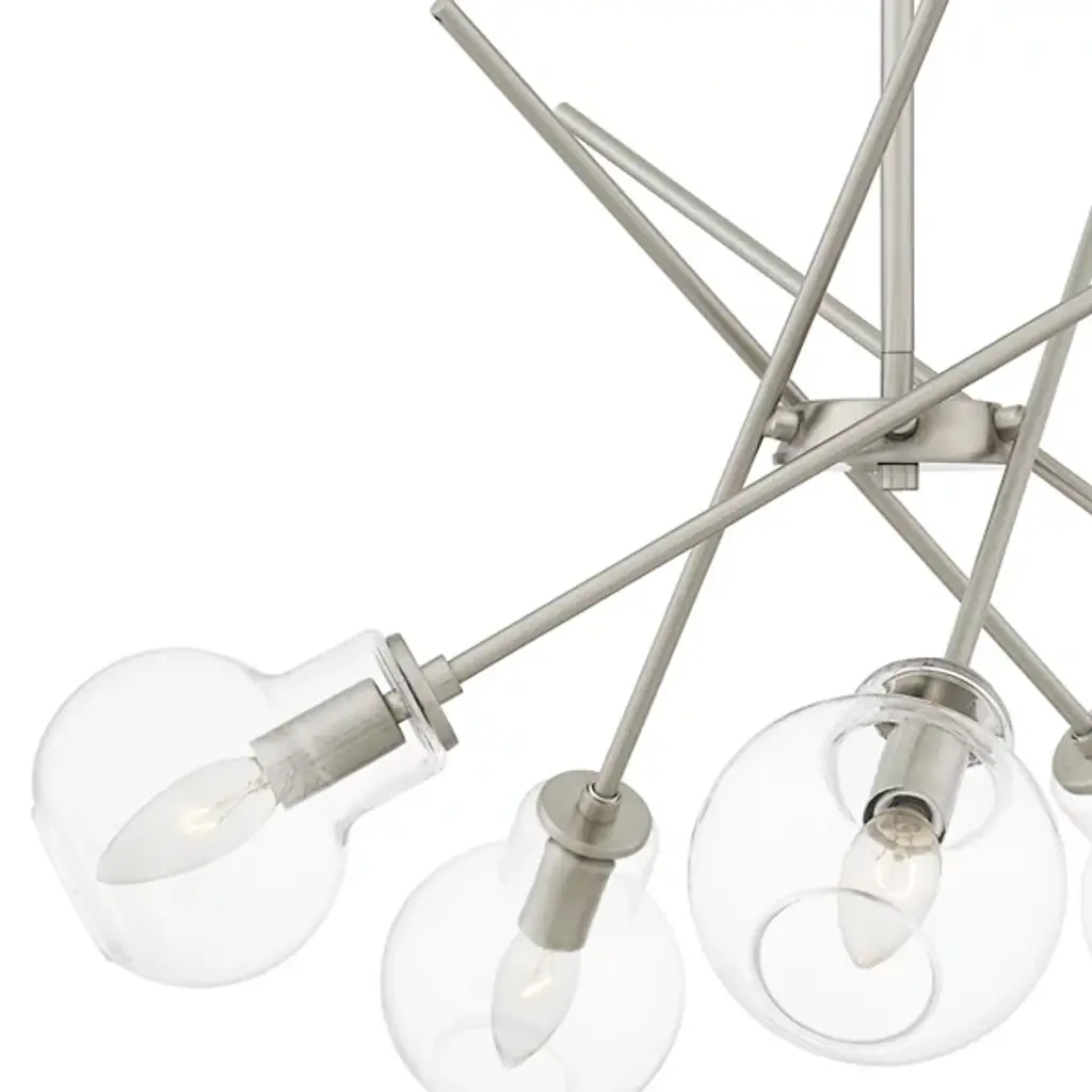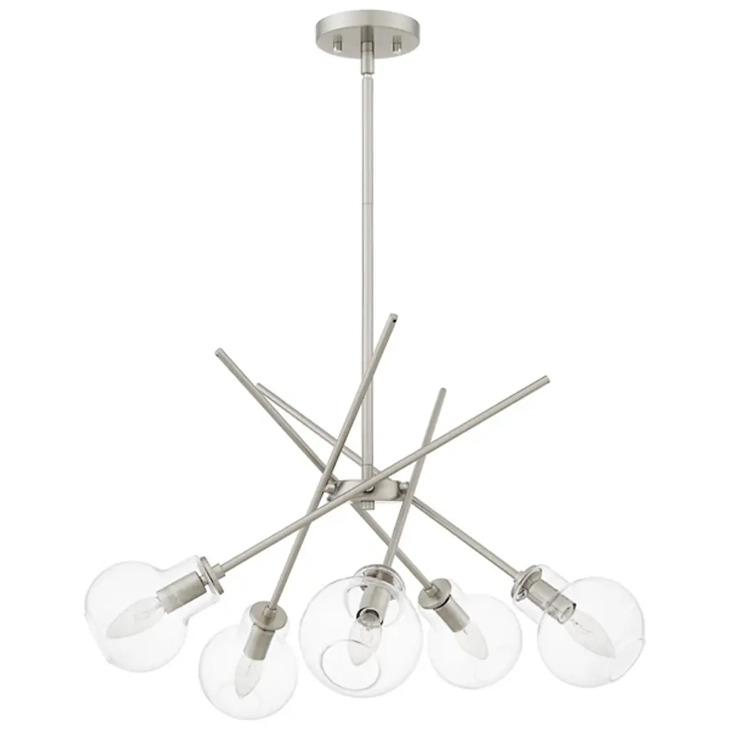 Experience the fusion of modernity and futurism with the Asha Chandelier from Quoizel where bold lines and glass orbs converge to create a striking aesthetic. Inspired by the sputnik design, this chandelier boasts open, clear glass globes that emit a playful lighting effect. With its geometric and dynamic design, Asha makes a captivating statement whether suspended over a kitchen island, dining table, or adorning a living room, adding an eye-catching allure to any space.
