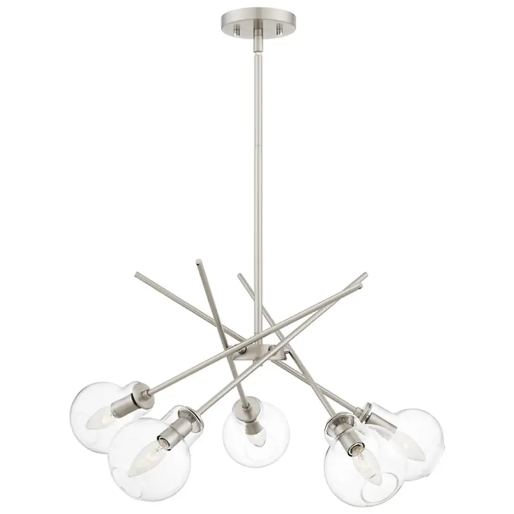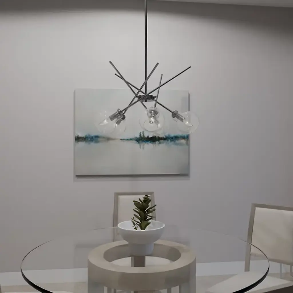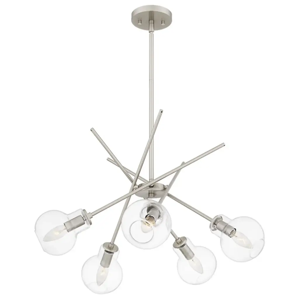 Experience the fusion of modernity and futurism with the Asha Chandelier from Quoizel where bold lines and glass orbs converge to create a striking aesthetic. Inspired by the sputnik design, this chandelier boasts open, clear glass globes that emit a playful lighting effect. With its geometric and dynamic design, Asha makes a captivating statement whether suspended over a kitchen island, dining table, or adorning a living room, adding an eye-catching allure to any space.