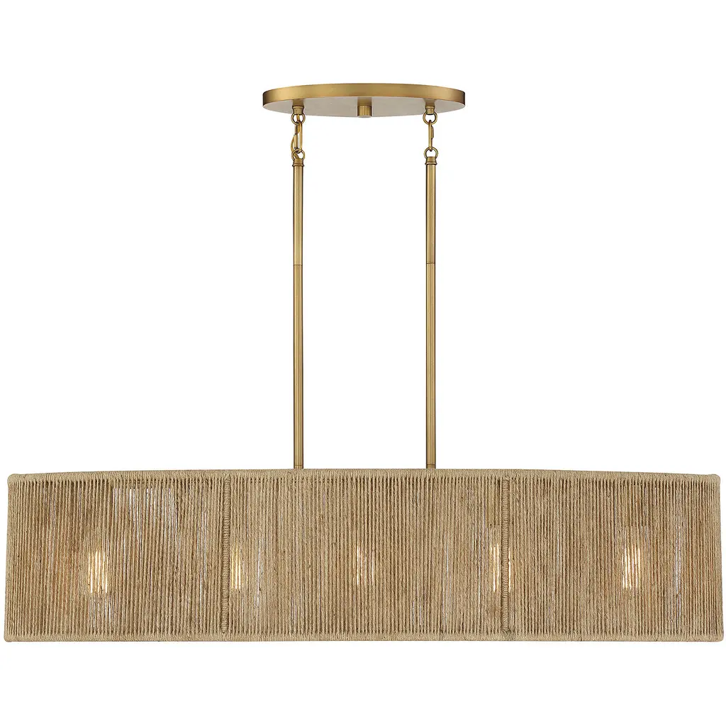 This Savoy House Ashe 5-light linear chandelier has a warm, organic design. Its oblong shade is strung with rows of textured rope, allowing light to shine through and providing a stylish look even when the lights are off. Finished in warm brass. Ashe is 42" in length, 14" in width and has an adjustable height ranging from 15" to 61". It uses five standard size bulbs with a max of 60 watts per bulb. Comes with eight 12" downrods and two 6" downrods, plus 80" of cord.