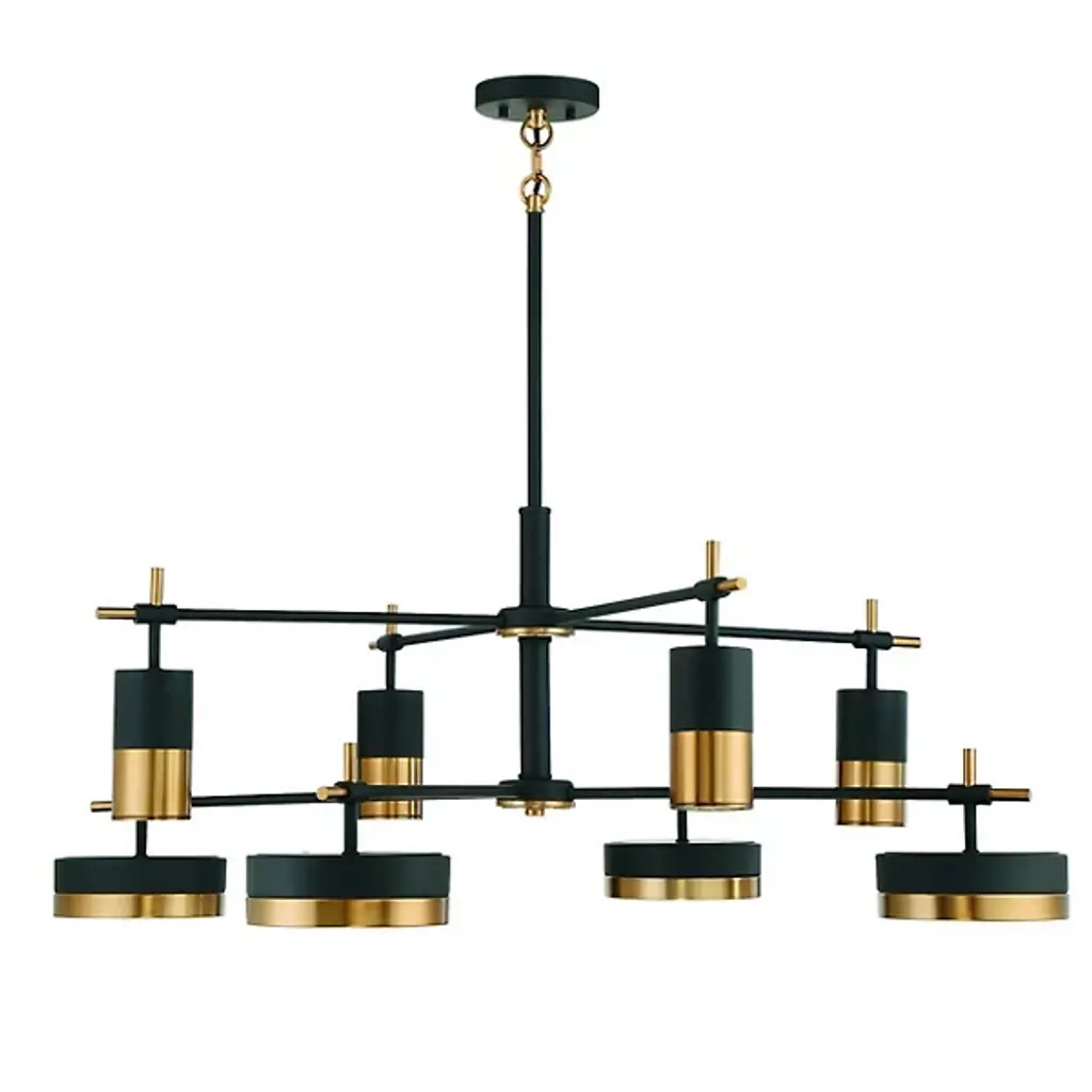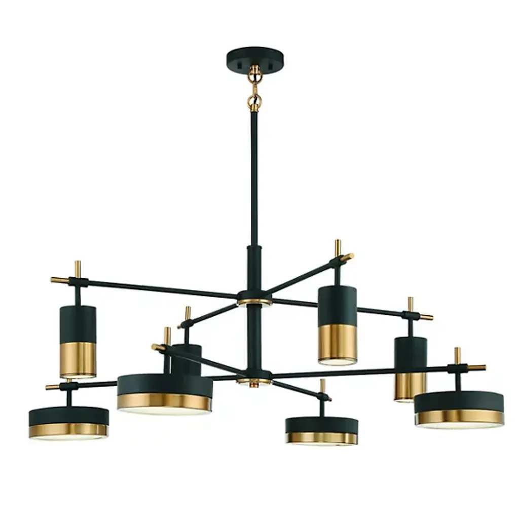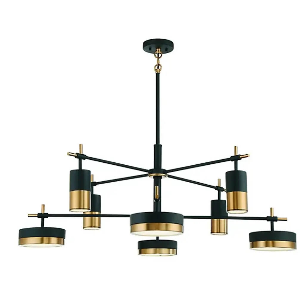 Sculptural and stylish. The Ashor LED 2 Tier Chandelier is a mid-mod inspired and contemporary composition presented by Savoy House. A two-tone contrast of matte black and warm brass adorns the metallic bodice. Integrated, energy-efficient LED illumination diffuses through the beautiful detail of the crushed crystal shade embedded into each disc. It drops from the ceiling on a matte black canopy and adjustable down rod, making a bold statement and brightening the surroundings beautifully.