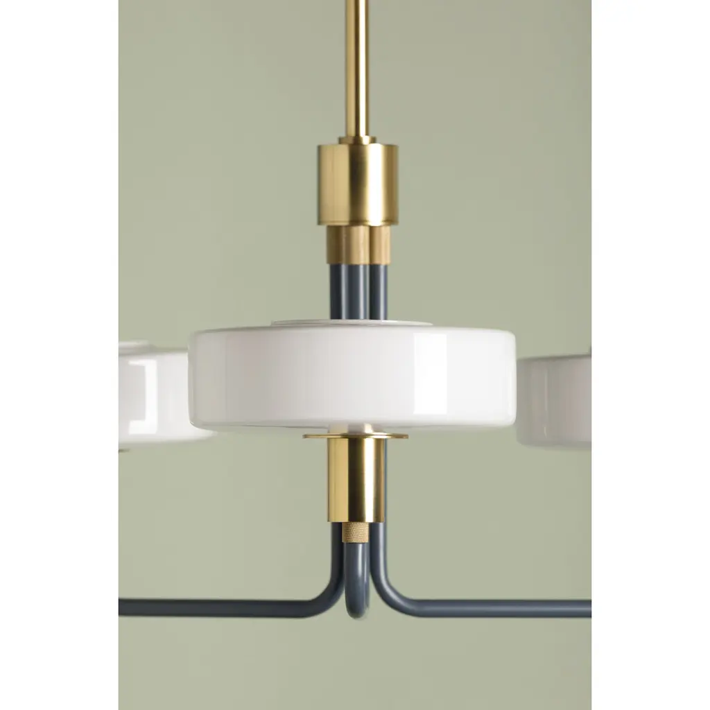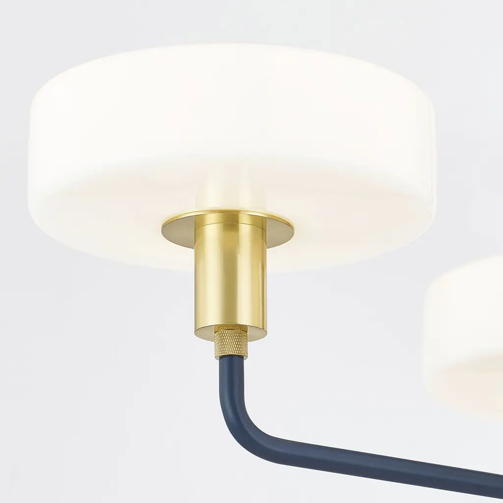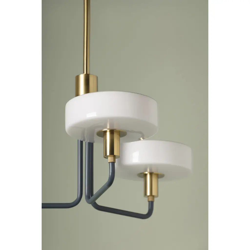 A modern statement piece in stylish Slate Blue, Aston features thick pillow-shaped shades made of Opal Shiny Glass balanced on a softly geometric frame. Sleek lines, right angles, and warm Aged Brass accents contribute to the striking stature of this fixture. Available as a sconce, 3-light and a 5-light chandelier, Aston fills any space with a warm glow. Part of our Zoe Feldman collection.