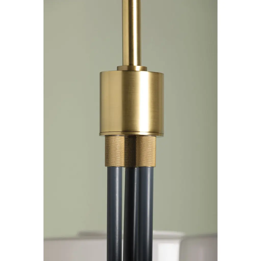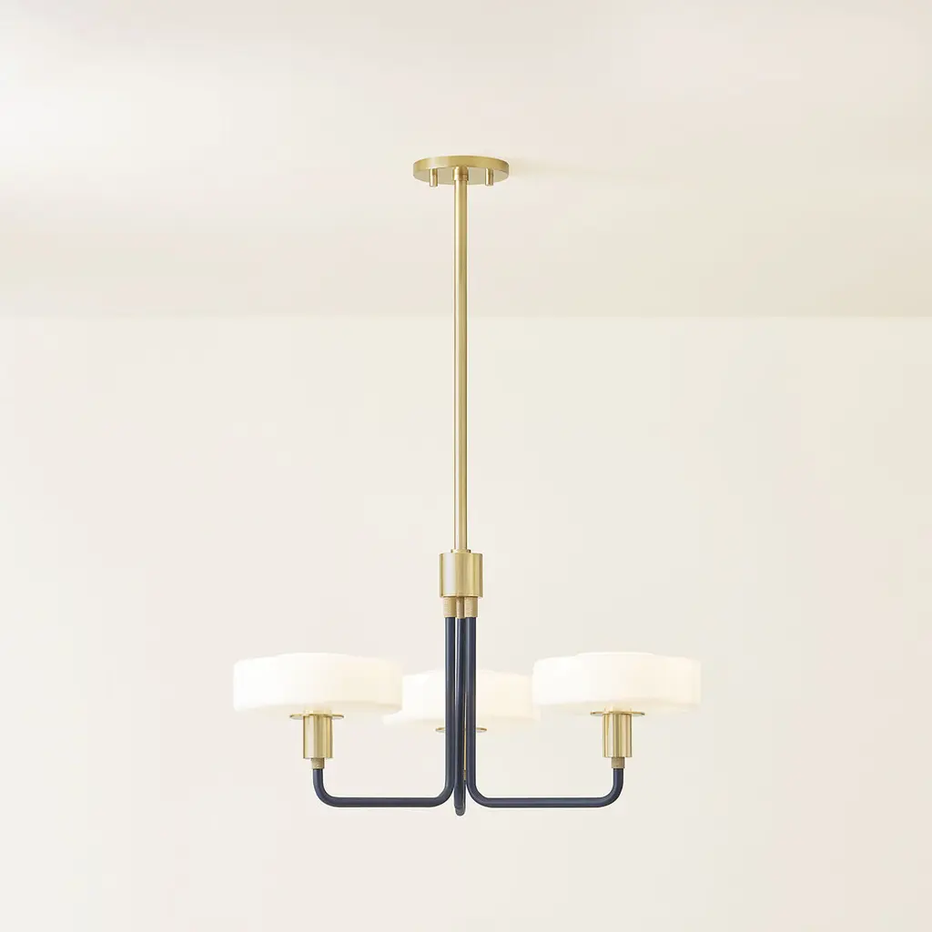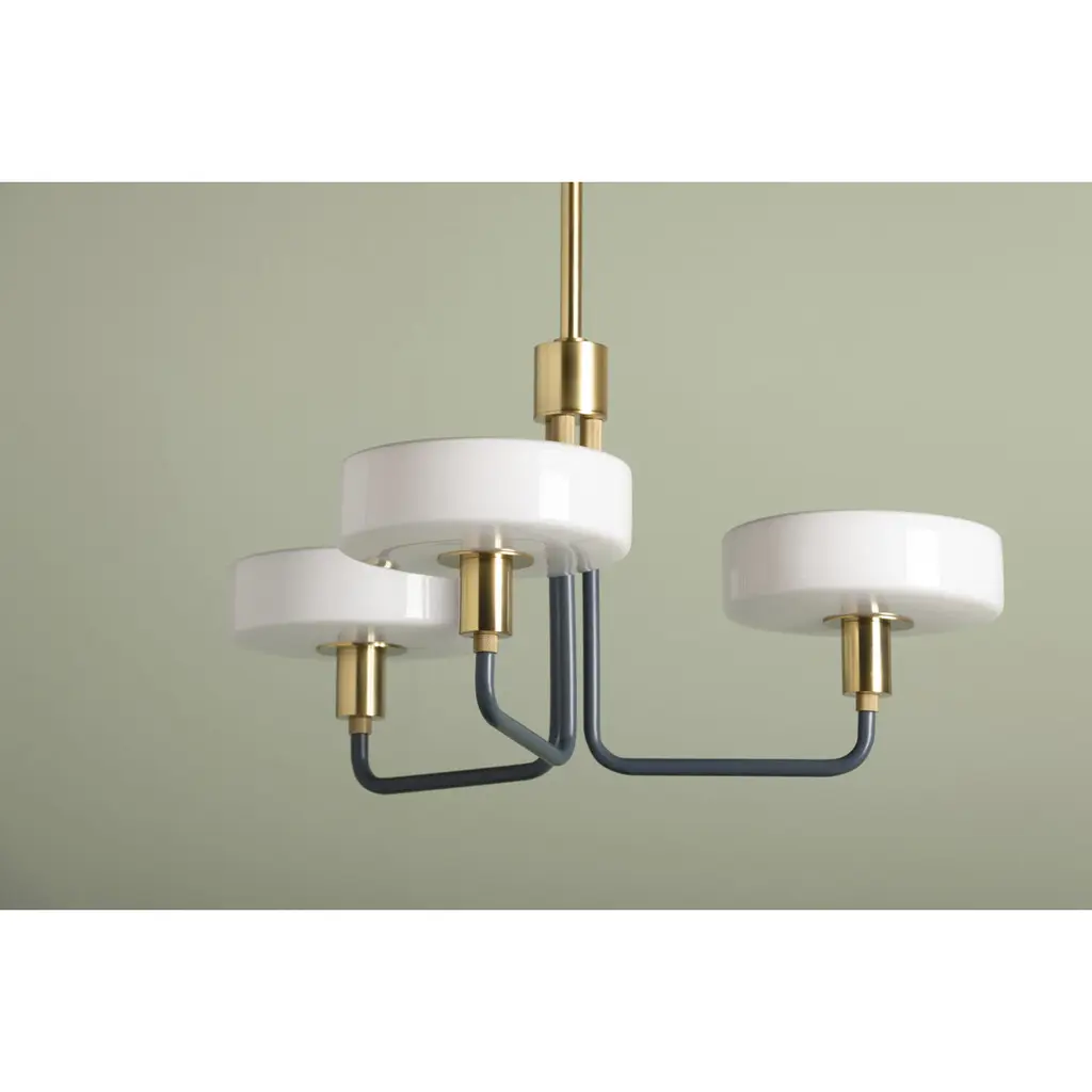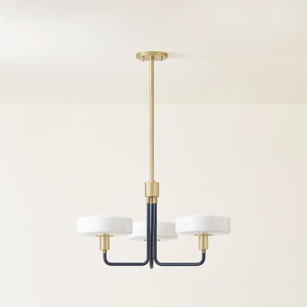 A modern statement piece in stylish Slate Blue, Aston features thick pillow-shaped shades made of Opal Shiny Glass balanced on a softly geometric frame. Sleek lines, right angles, and warm Aged Brass accents contribute to the striking stature of this fixture. Available as a sconce, 3-light and a 5-light chandelier, Aston fills any space with a warm glow. Part of our Zoe Feldman collection.