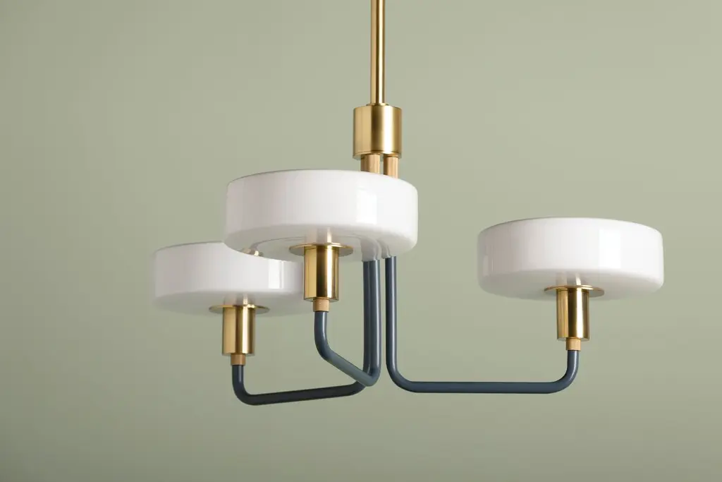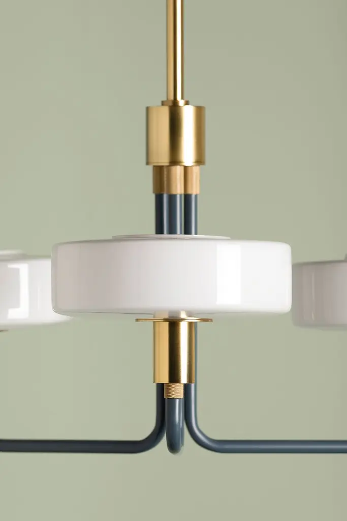 A modern statement piece, Aston features thick pillow-shaped shades made of Opal Shiny Glass balanced on a softly geometric frame. Sleek lines, right angles, and warm accents contribute to the striking stature of this fixture. Available as a sconce, 3-light and a 5-light chandelier, Aston fills any space with a warm glow. Part of our collection.