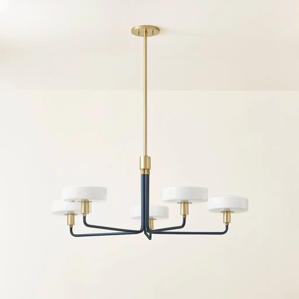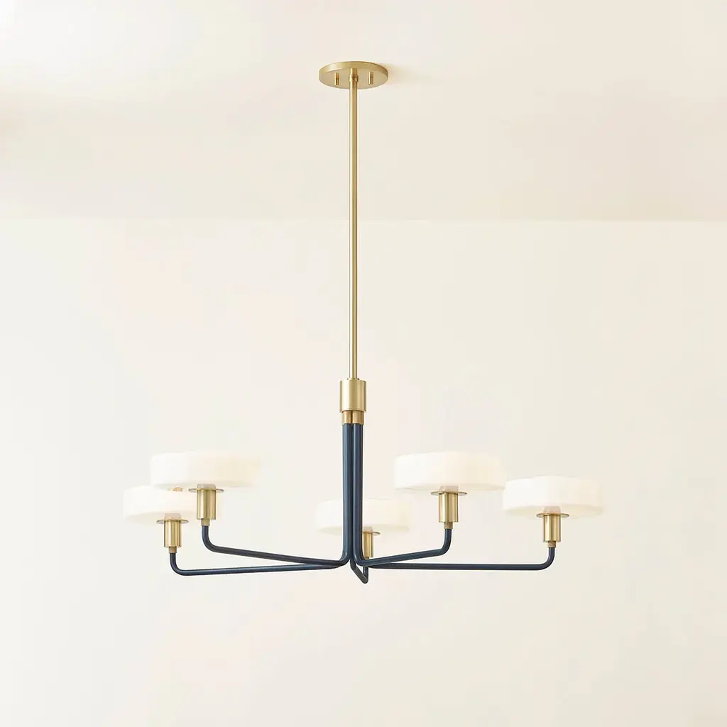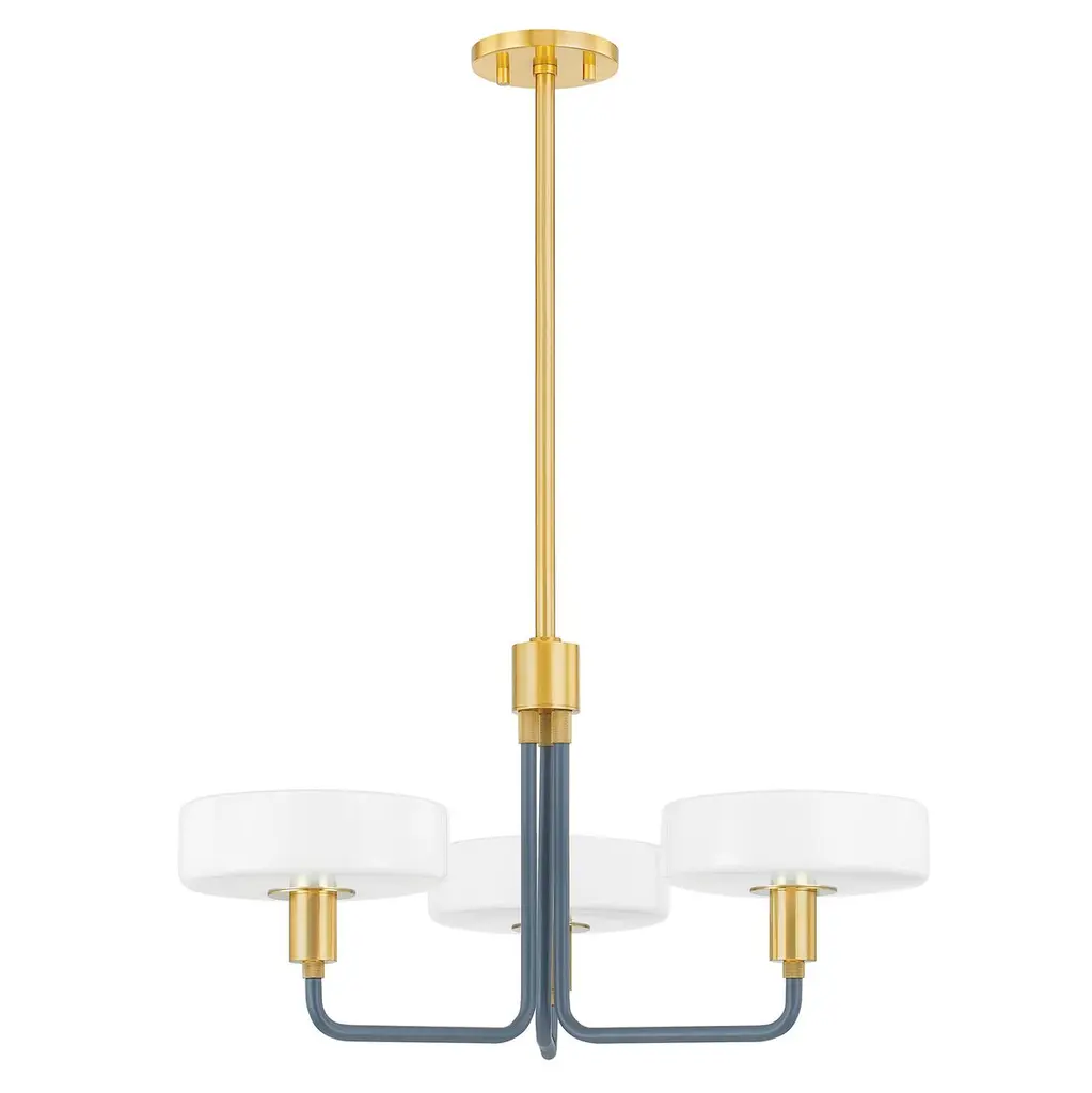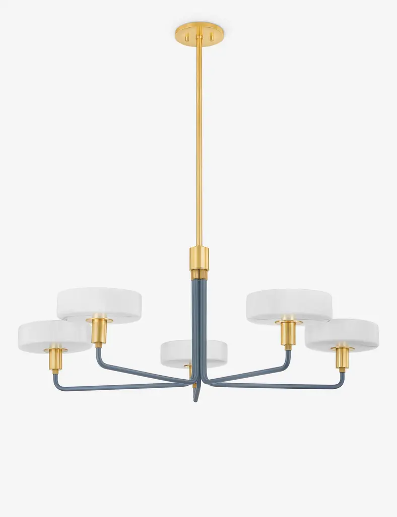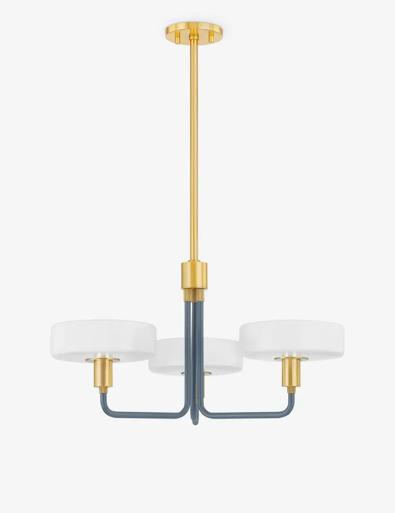 A modern statement piece in stylish Slate Blue, Aston features thick pillow-shaped shades made of Opal Shiny Glass balanced on a softly geometric frame. Sleek lines, right angles, and warm Aged Brass accents contribute to the striking stature of this fixture. Available as a sconce, 3-light and a 5-light chandelier, Aston fills any space with a warm glow. Part of our Zoe Feldman collection.