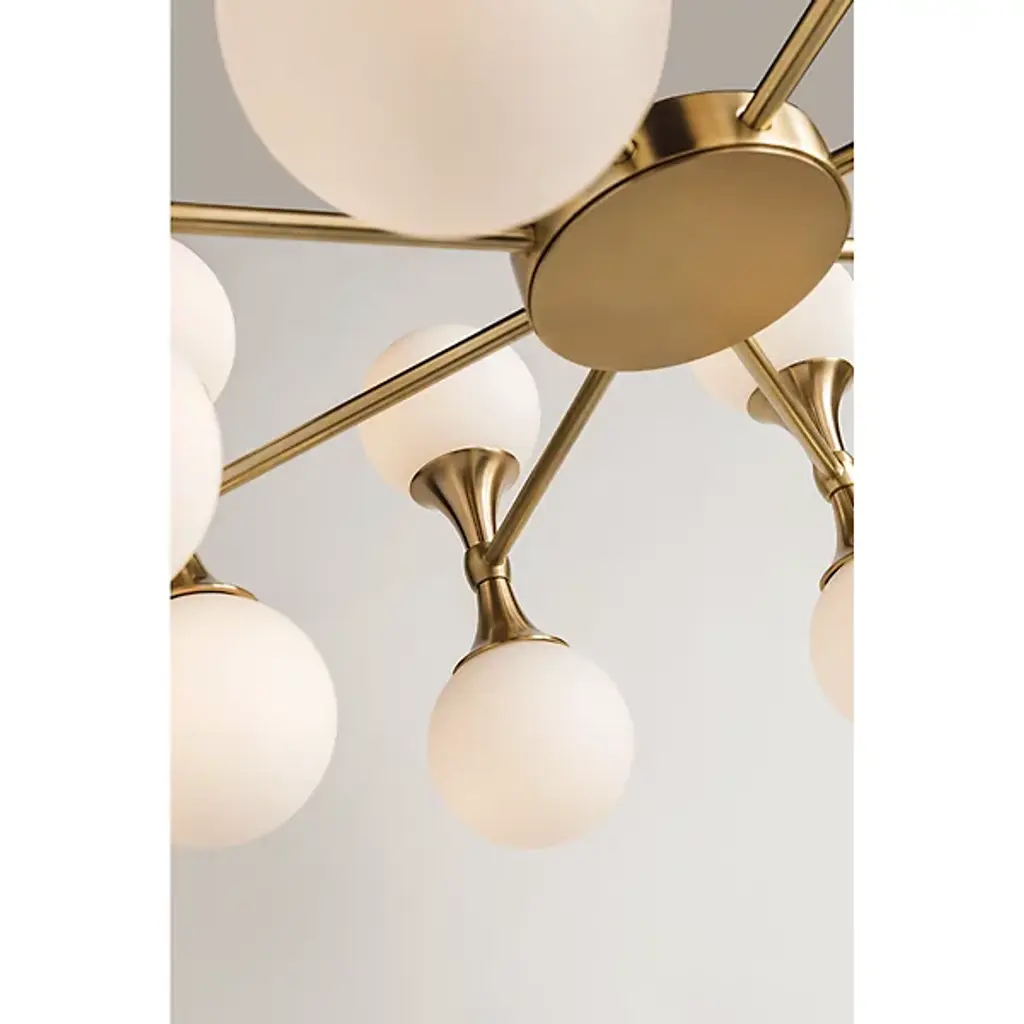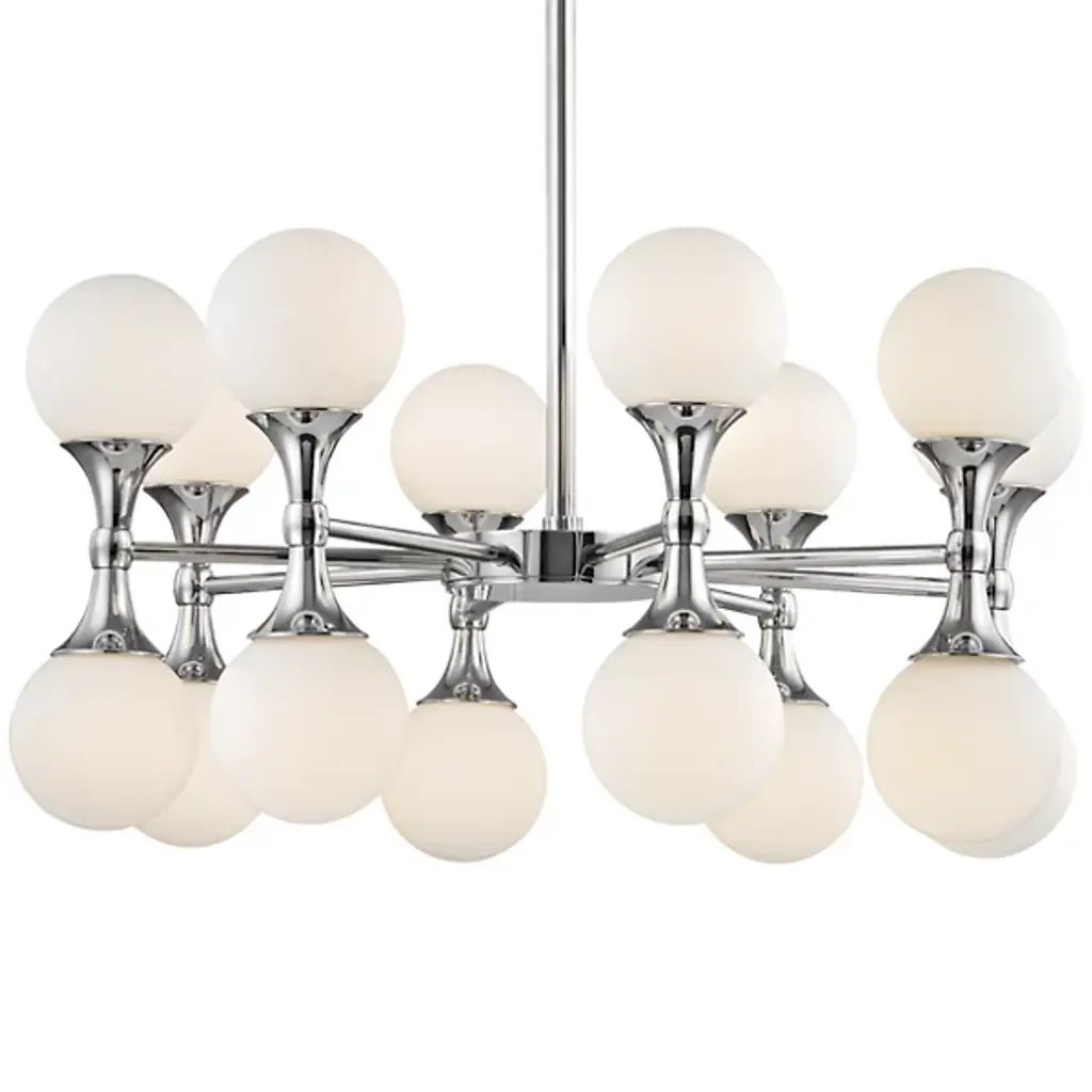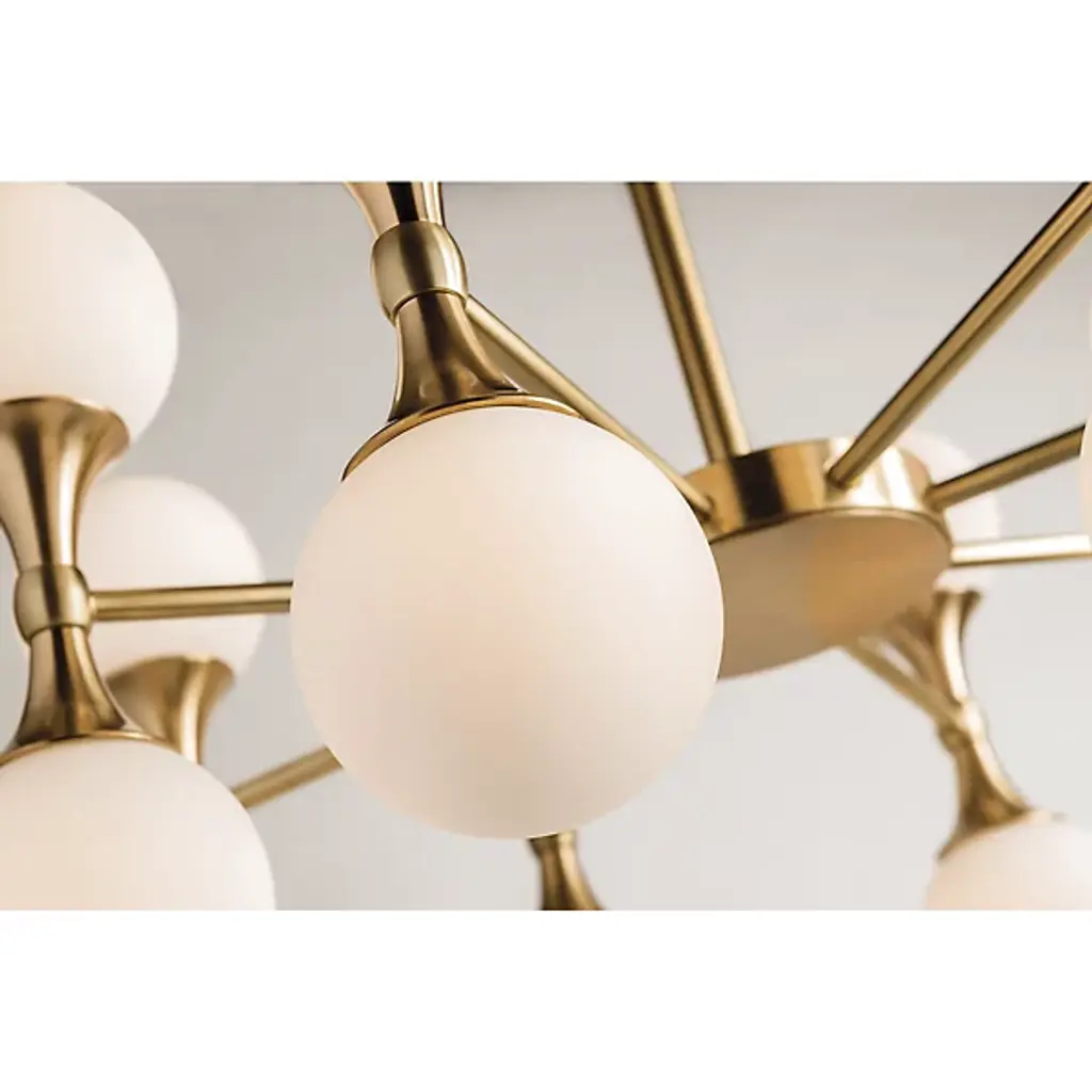 The Astoria LED Chandelier by Hudson Valley Lighting brings life to your living space with its warm lighting and retro chic design. Its body consists of a series of tapered metal holders that extend equidistant from a central hub. Each holder supports a pair of opposing Opal Matte Etched Glass shades that, once lit, provide an even, glare-free ambiance that resembles an old camera flashbulb or vanity lights in an antiquated dressing room.
