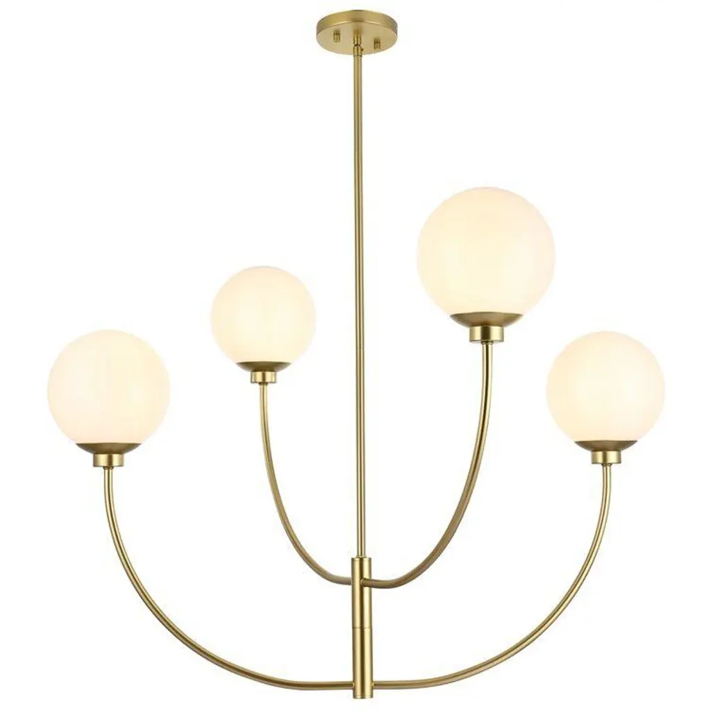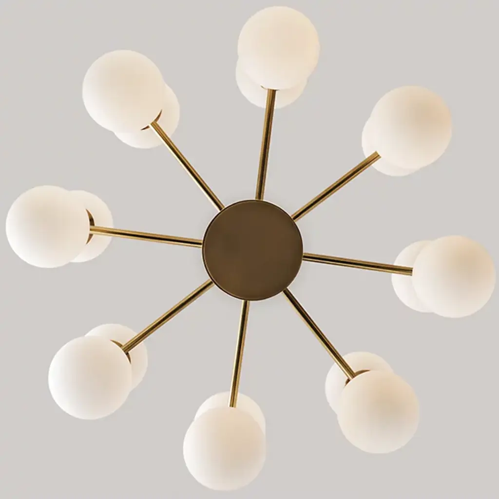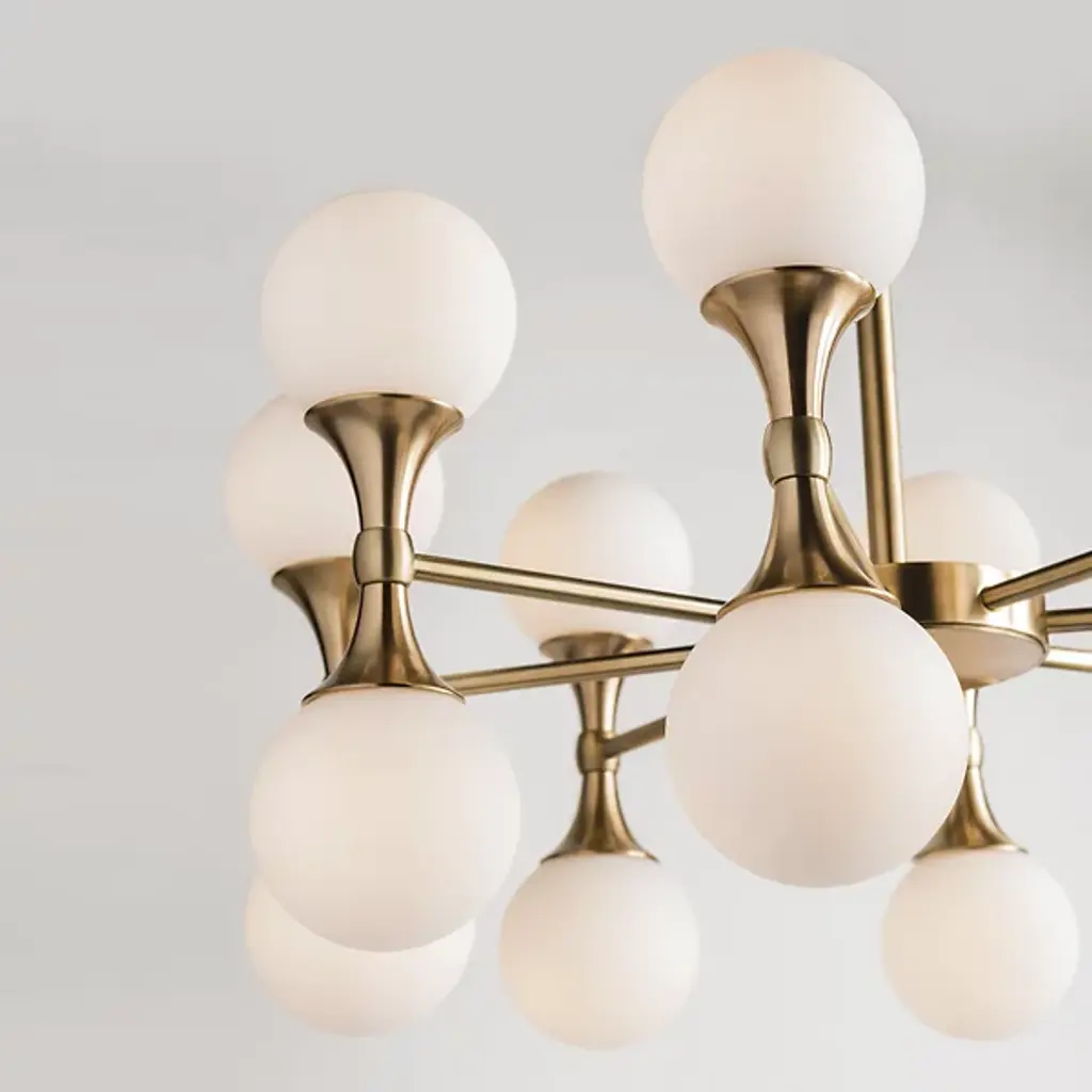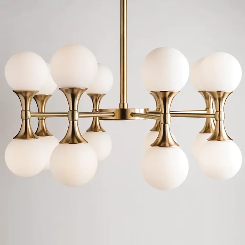 The Astoria LED Chandelier by Hudson Valley Lighting brings life to your living space with its warm lighting and retro chic design. Its body consists of a series of tapered metal holders that extend equidistant from a central hub. Each holder supports a pair of opposing Opal Matte Etched Glass shades that, once lit, provide an even, glare-free ambiance that resembles an old camera flashbulb or vanity lights in an antiquated dressing room.