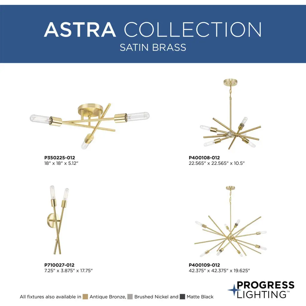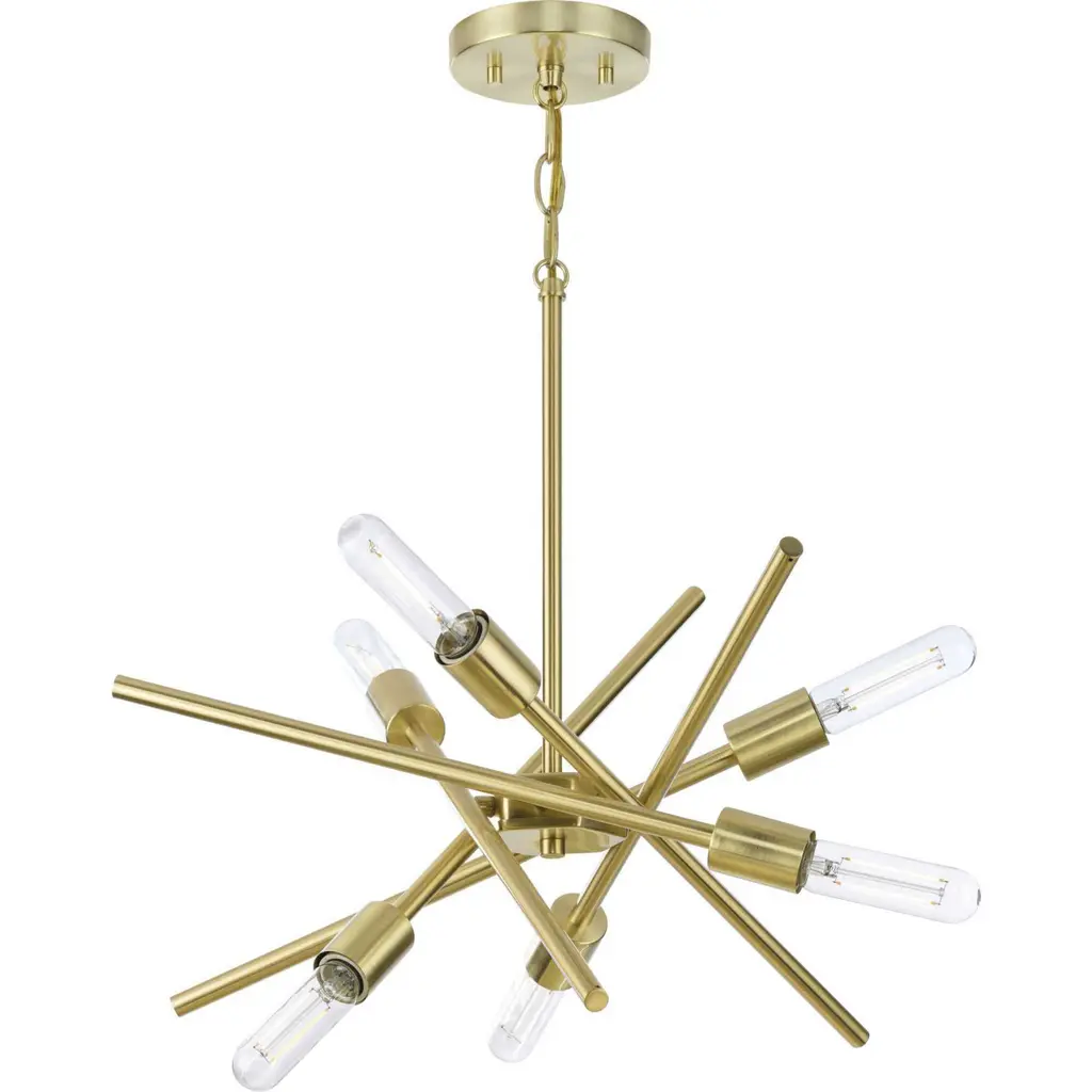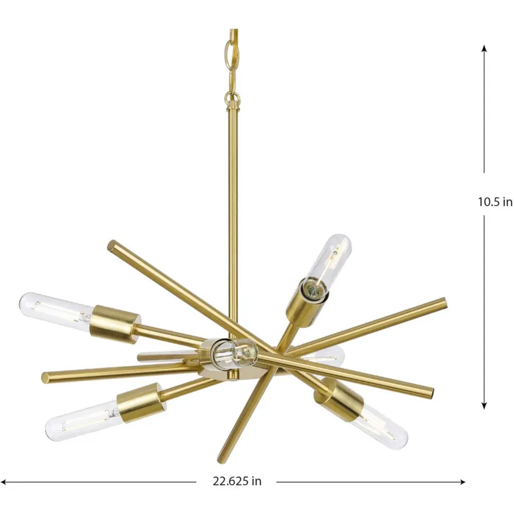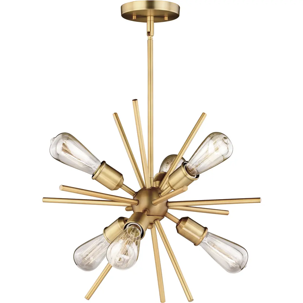 The Astra chandelier features a space-age-inspired design perfect for modern and mid-century decor. Six spoked arms radiate out from a cylindrical down rod suspended from a center round canopy, bringing a dynamic flair to the fixture's design. A lovely satin brass finish adds a touch of soft glamour. Decorative bulbs (sold separately) adorn the ends of each perpendicular arm. This versatile chandelier is ideal for bringing illumination to dining rooms, kitchens and bedrooms. This fixture is part of the Progress Lighting Design Series, a lighting collection offering fashionable styles and affordable luxury lighting for the home.