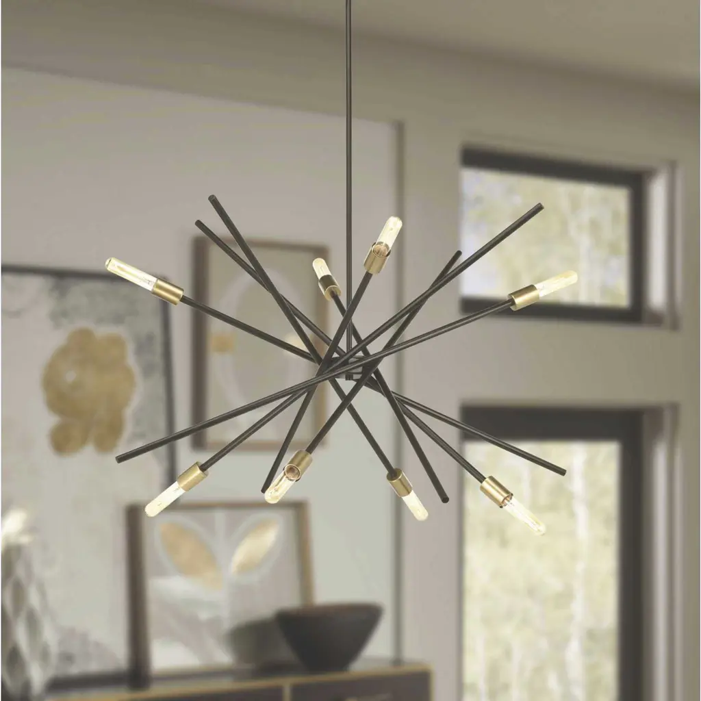An iconic fixture, Astra features an organic, asymmetrical design. Ideal for dining room settings or entryways, these space-aged inspired pieces are so versatile they can be incorporated into a variety of interiors. Eight-Light Chandelier. Antique Bronze finish.