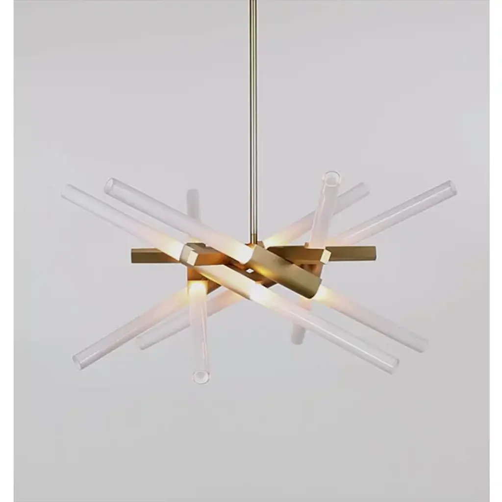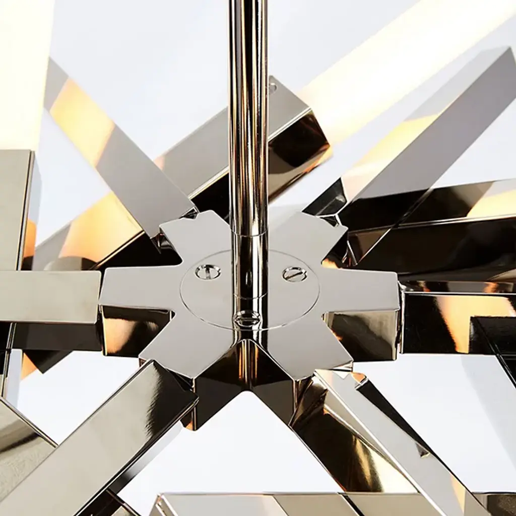 The Astral Agnes Chandelier by Roll & Hill is an abstract designed pendant light based on designer Lindsey Adelman's Agnes collection. The design re-configures the modular units of the original series into radial, symmetrical forms that channel galactic phenomena and space travel. The pendant light fixture is available in four different finish options with straight or angle-cut glass.