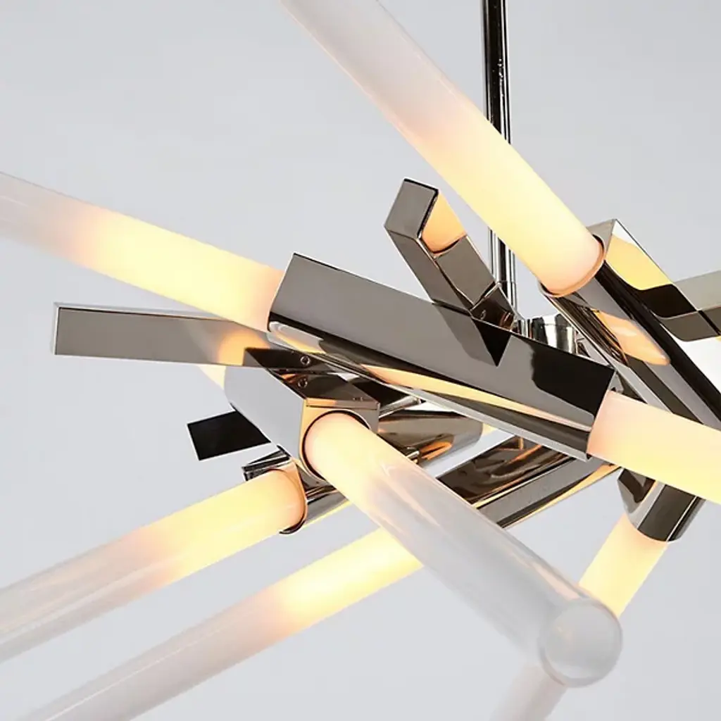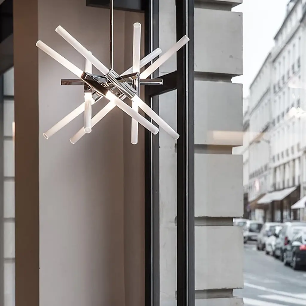 The Astral Agnes Chandelier by Roll & Hill is an abstract designed pendant light based on designer Lindsey Adelman's Agnes collection. The design re-configures the modular units of the original series into radial, symmetrical forms that channel galactic phenomena and space travel. The pendant light fixture is available in four different finish options with straight or angle-cut glass.