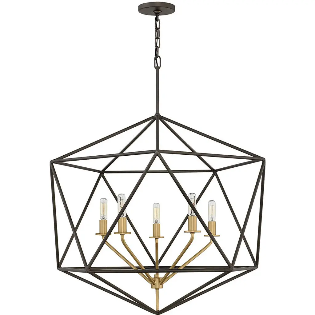 Sleek and chic, Astrid is designed as an airy geometric beauty balanced with robust welded construction. The inner light cluster, uniquely wired from the bottom, appears to float inside the outer cage. The two-tone finish further enhances the layering effect for added depth and dimension.