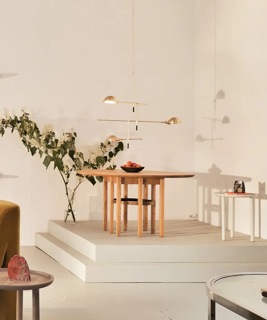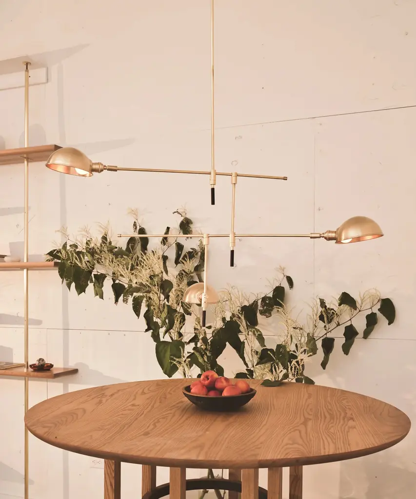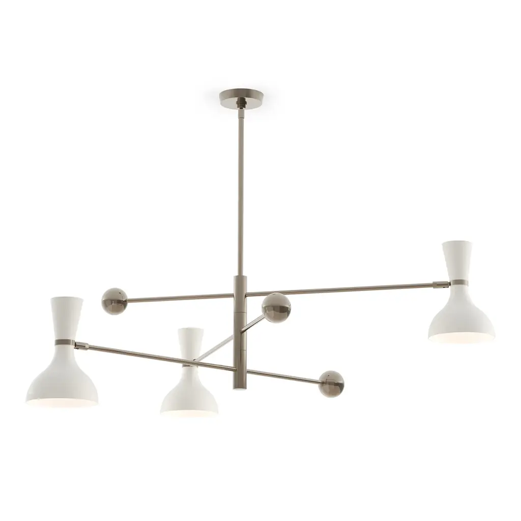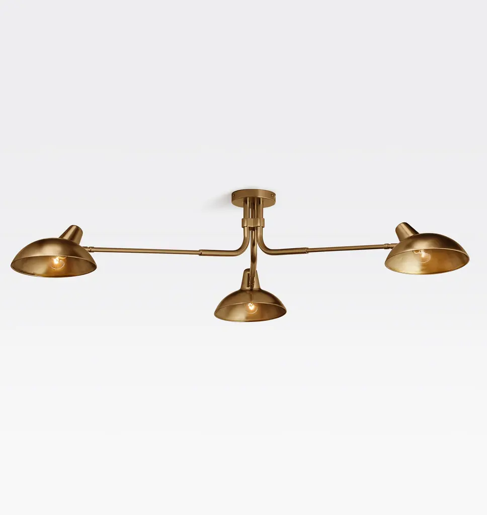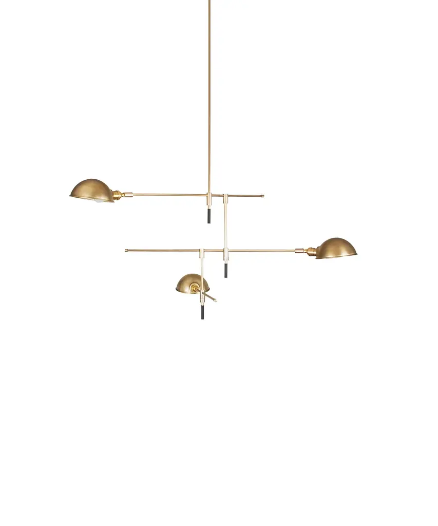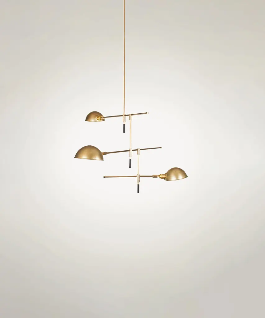 Parabolic brass shades and swiveling arms elevate this richly composed fixture. The Atlas Chandelier features three adjustable lights. Emulating a mobile, the length and placement of each arm results in a balanced form. Each piece is designed and hand-produced by Coil + Drift, a lauded New York's Catskill Mountains-based design studio known for its vividly three-dimensional and material-forward collections.