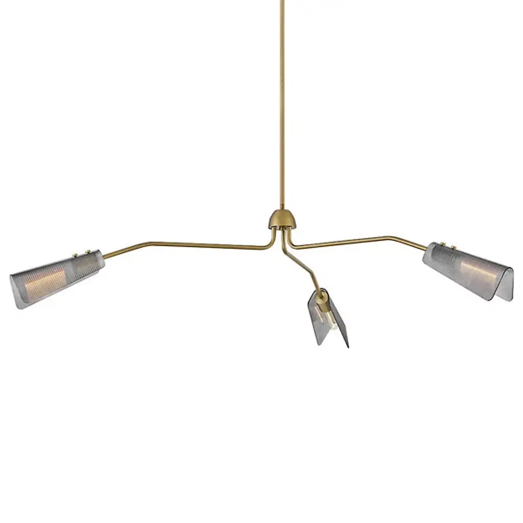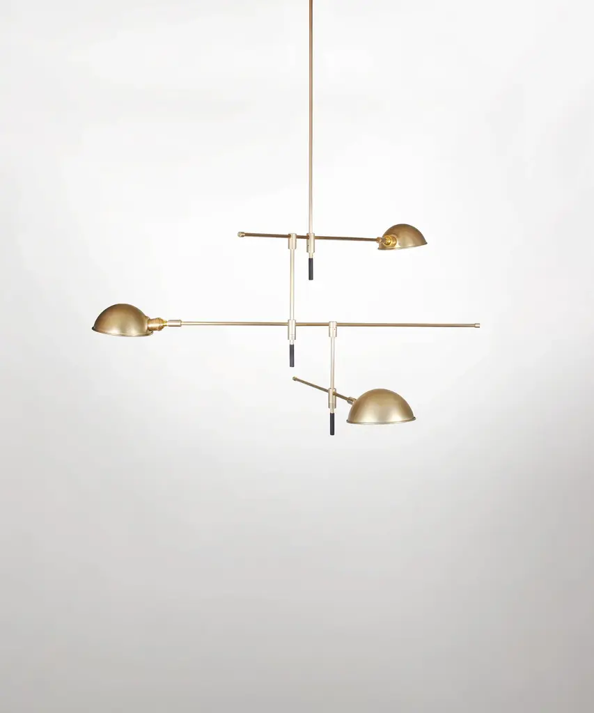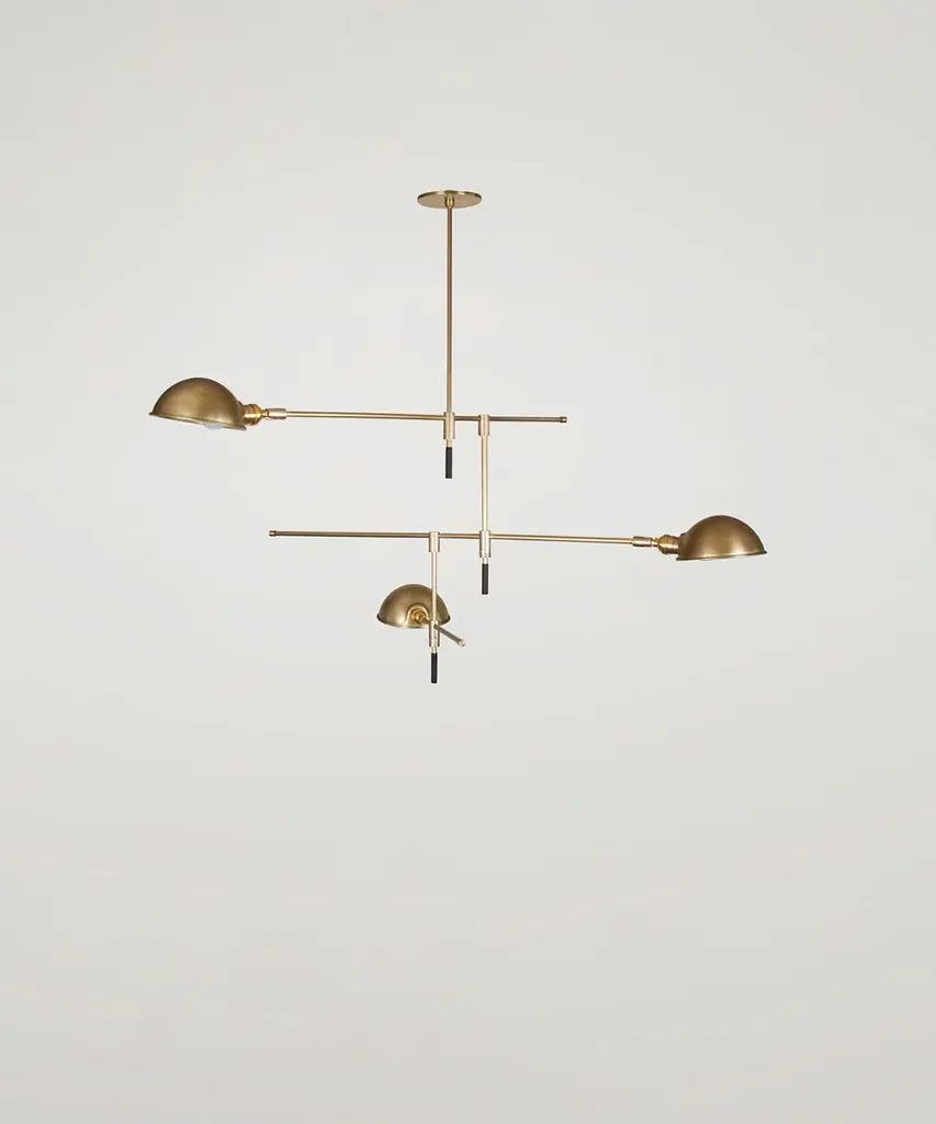 Parabolic brass shades and swiveling arms elevate this richly composed fixture. The Atlas Chandelier features three adjustable lights. Emulating a mobile, the length and placement of each arm results in a balanced form. Each piece is designed and hand-produced by Coil + Drift, a lauded New York's Catskill Mountains-based design studio known for its vividly three-dimensional and material-forward collections.