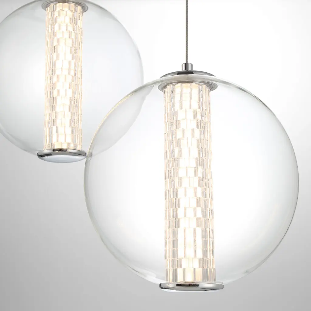 A fascinating globe fixture, Atomo offers a unique and proprietary LED lamping called CRYSTAL PITCHTM. Faceted crystal gears surround the LED light source to emit spectacular refraction within the crystal glass globe.