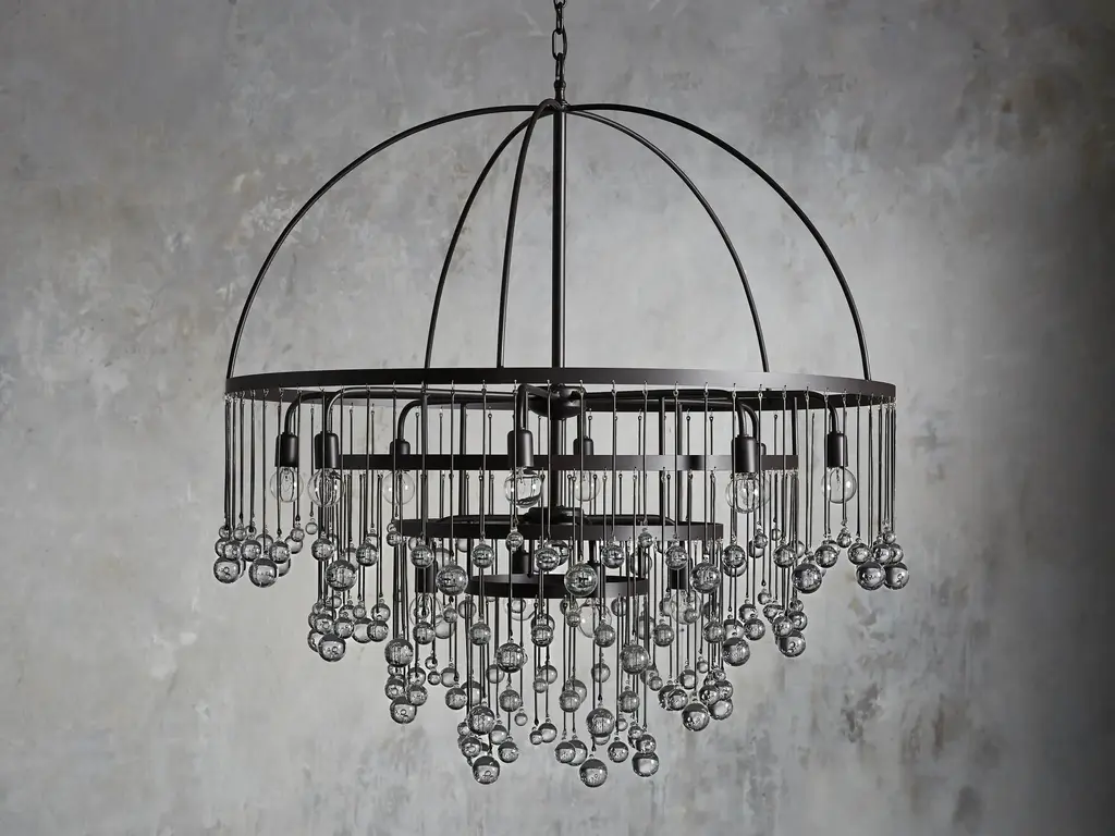 Equally at home in an ancient French castle or a downtown New Orleans loft, our Aubrey Chandelier creates dramatic ambiance in any setting. Crystal drops hanging in varying lengths from an iron cage create the illusion of movement as they catch the light, refracting brilliant beams around your room.