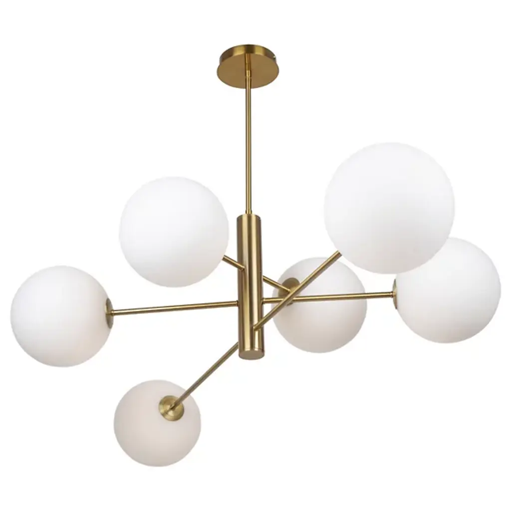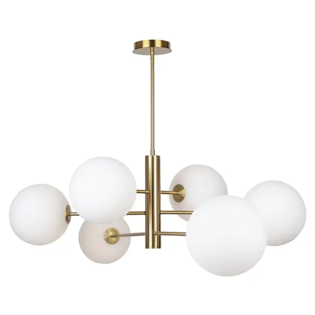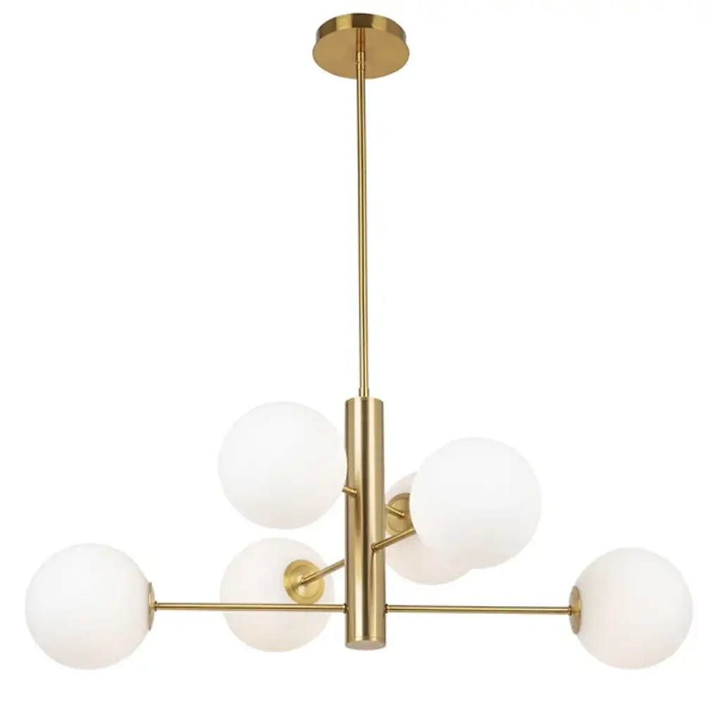 Experience the captivating allure of the Aurelia Chandelier from Artcraft, which radiates contemporary charm with its brushed brass frame exuding warmth. Each arm adorned with spherical white glassware creates a striking contrast, emitting soft, inviting illumination. This product seamlessly blends sleek design with a cozy aesthetic, making it a stylish and captivating addition to any space where modernity meets comfort in perfect harmony, elevating your ambiance with its enchanting presence.